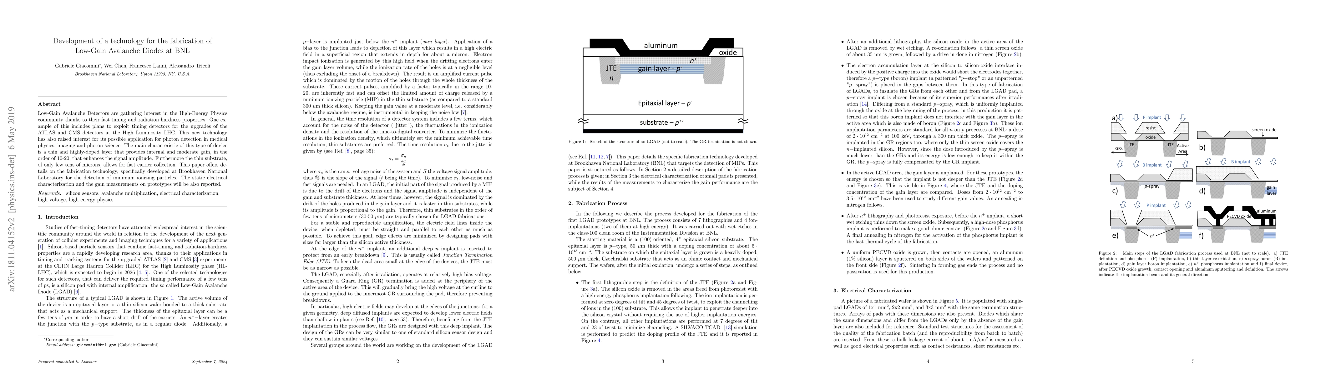 This paper details the development of a fabrication technology for Low-Gain Avalanche Detectors at Brookhaven National Laboratory, emphasizing their fast-timing and radiation-hardness for applications in High-Energy Physics, including upgrades to ATLAS and CMS detectors. Static electrical characterization and gain measurements on prototypes are also reported.