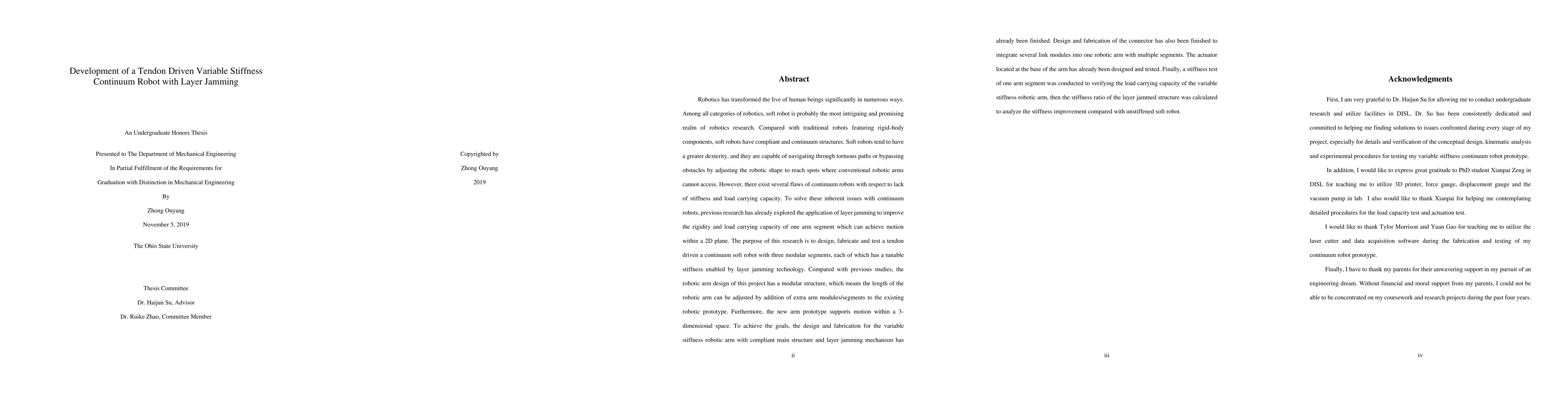 The purpose of this research is to design, fabricate and test a tendon driven a continuum soft robot with three modular segments, each of which has a tunable stiffness enabled by layer jamming technology. Compared with previous studies, the robotic arm design of this project has a modular structure, which means the length of the robotic arm can be adjusted by addition of extra arm modules/segments to the existing robotic prototype. Furthermore, the new arm prototype supports motion within a 3-dimensional space. To achieve the goals, the design and fabrication for the variable stiffness robotic arm with compliant main structure and layer jamming mechanism has already been finished. Design and fabrication of the connector has also been finished to integrate several link modules into one robotic arm with multiple segments. The actuator located at the base of the arm has already been designed and tested. Finally, a stiffness test of one arm segment was conducted to verifying the load carrying capacity of the variable stiffness robotic arm, then the stiffness ratio of the layer jammed structure was calculated to analyze the stiffness improvement compared with unstiffened soft robot.