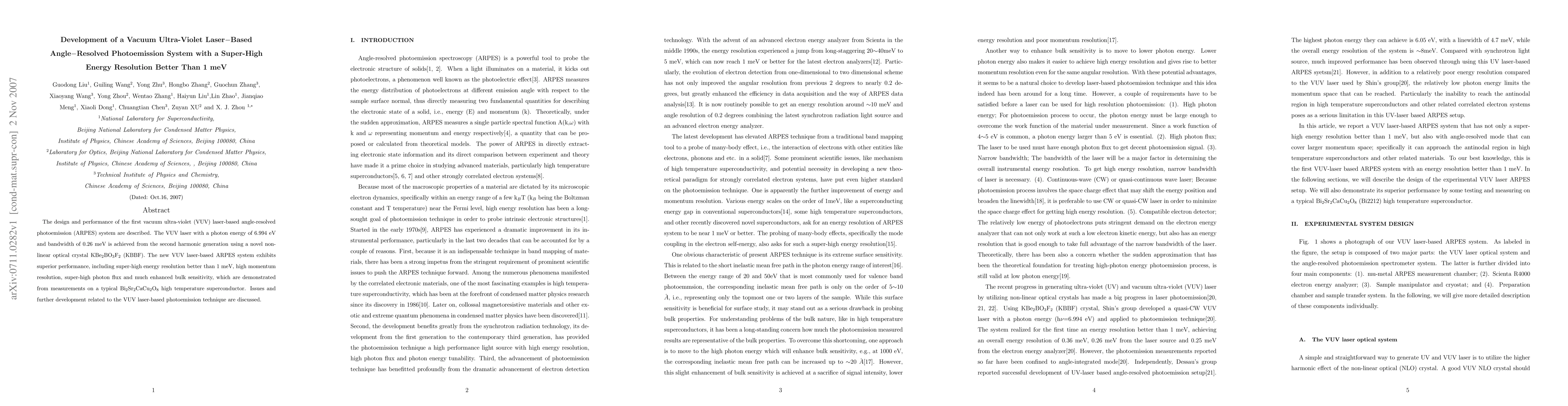 The design and performance of the first vacuum ultra-violet (VUV) laser-based angle-resolved photoemission (ARPES) system are described. The VUV laser with a photon energy of 6.994 eV and bandwidth of 0.26 meV is achieved from the second harmonic generation using a novel non-linear optical crystal KBe2BO3F2 (KBBF). The new VUV laser-based ARPES system exhibits superior performance, including super-high energy resolution better than 1 meV, high momentum resolution, super-high photon flux and much enhanced bulk sensitivity, which are demonstrated from measurements on a typical Bi2Sr2CaCu2O8 high temperature superconductor. Issues and further development related to the VUV laser-based photoemission technique are discussed.