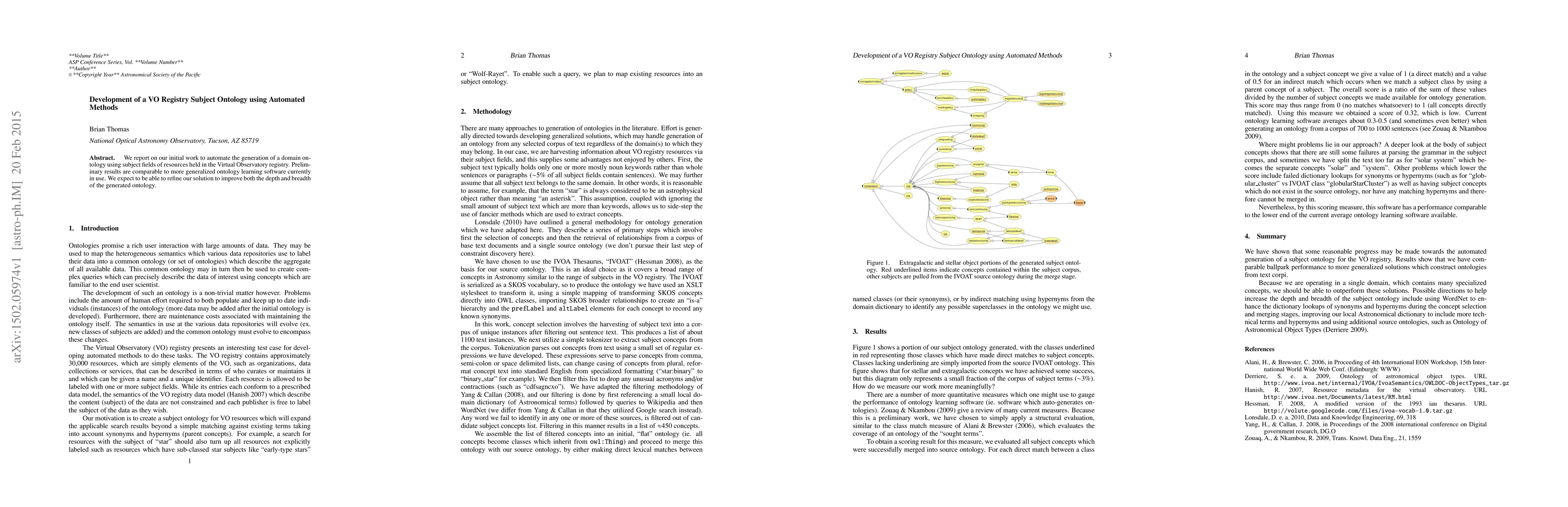 Researchers developed an automated method to generate a domain ontology from subject fields in the Virtual Observatory registry, achieving comparable results to existing software. The goal is to refine the solution to improve its depth and breadth.