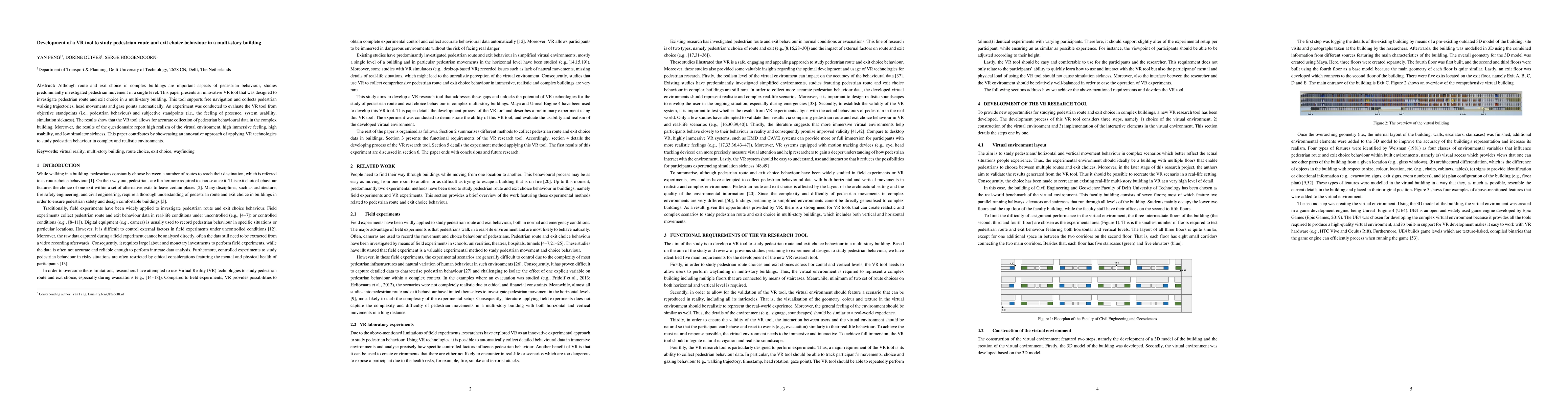 This paper develops a VR tool to study pedestrian route and exit choice in multi-story buildings, collecting data on walking trajectories, head movements, and gaze points. The tool was evaluated for realism, usability, and simulator sickness, showing high accuracy and user satisfaction.