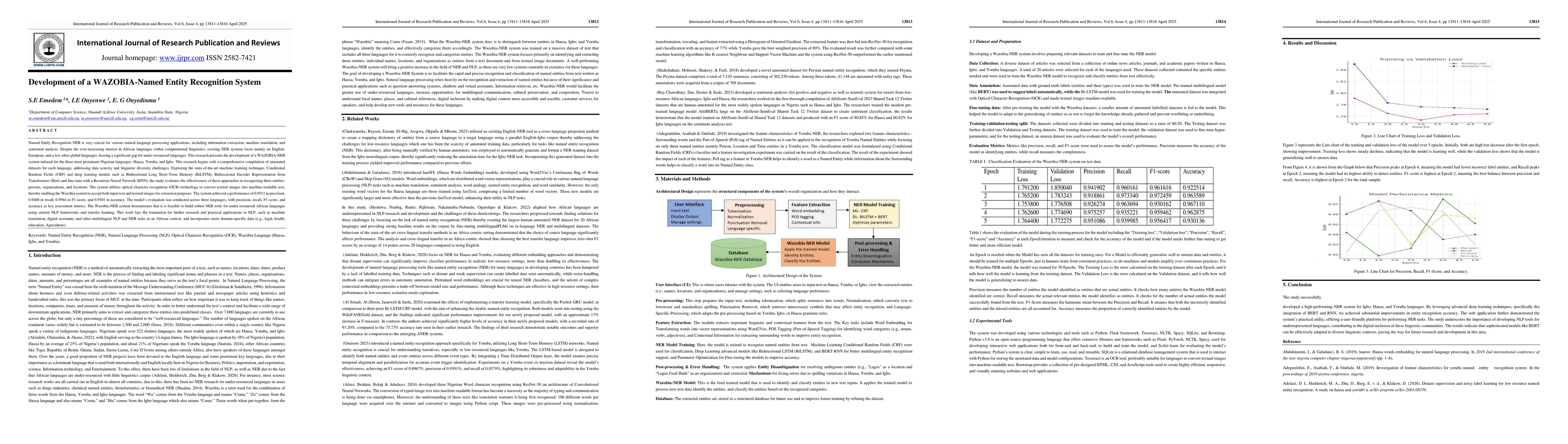 The development of the WAZOBIA-NER system, which integrates OCR technology with advanced machine learning and deep learning models for NER in under-resourced African languages.