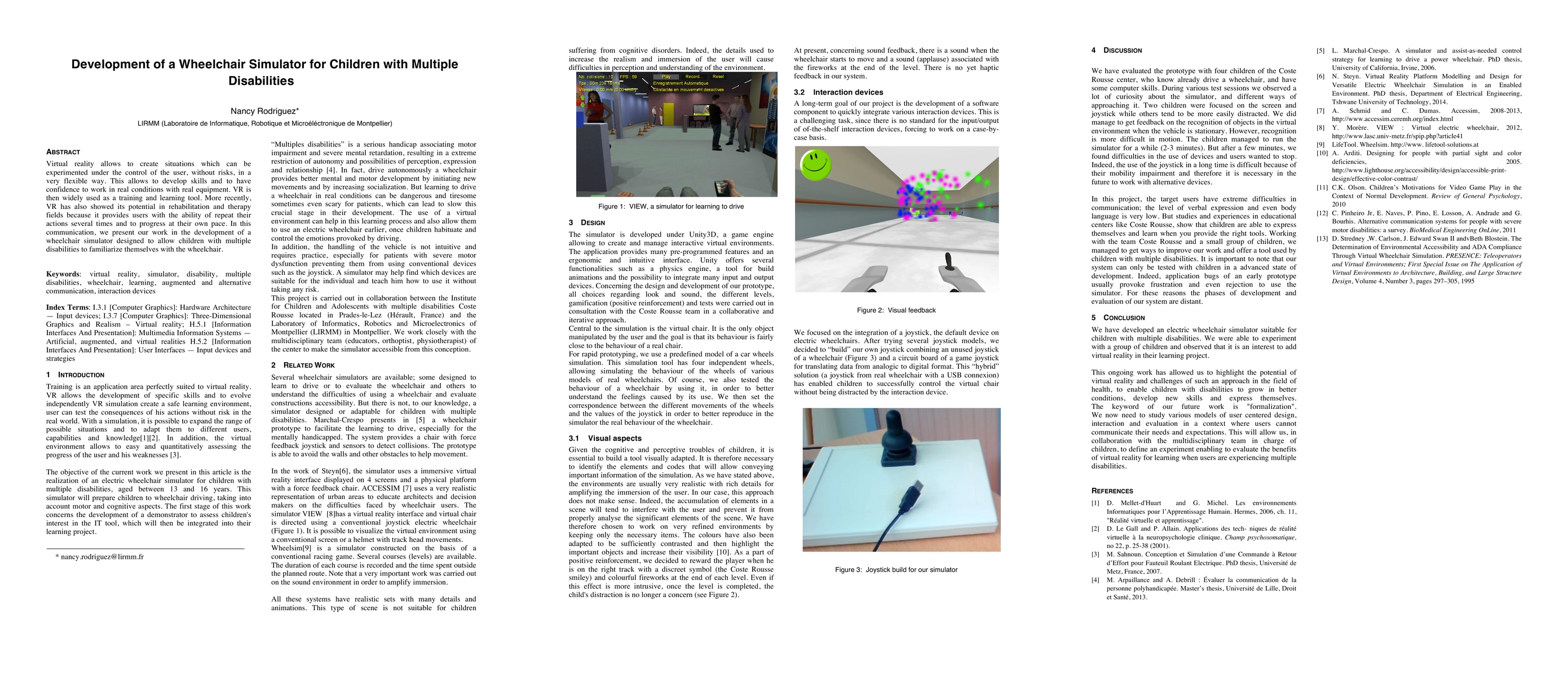 Virtual reality allows to create situations which can be experimented under the control of the user, without risks, in a very flexible way. This allows to develop skills and to have confidence to work in real conditions with real equipment. VR is then widely used as a training and learning tool. More recently, VR has also showed its potential in rehabilitation and therapy fields because it provides users with the ability of repeat their actions several times and to progress at their own pace. In this communication, we present our work in the development of a wheelchair simulator designed to allow children with multiple disabilities to familiarize themselves with the wheelchair.