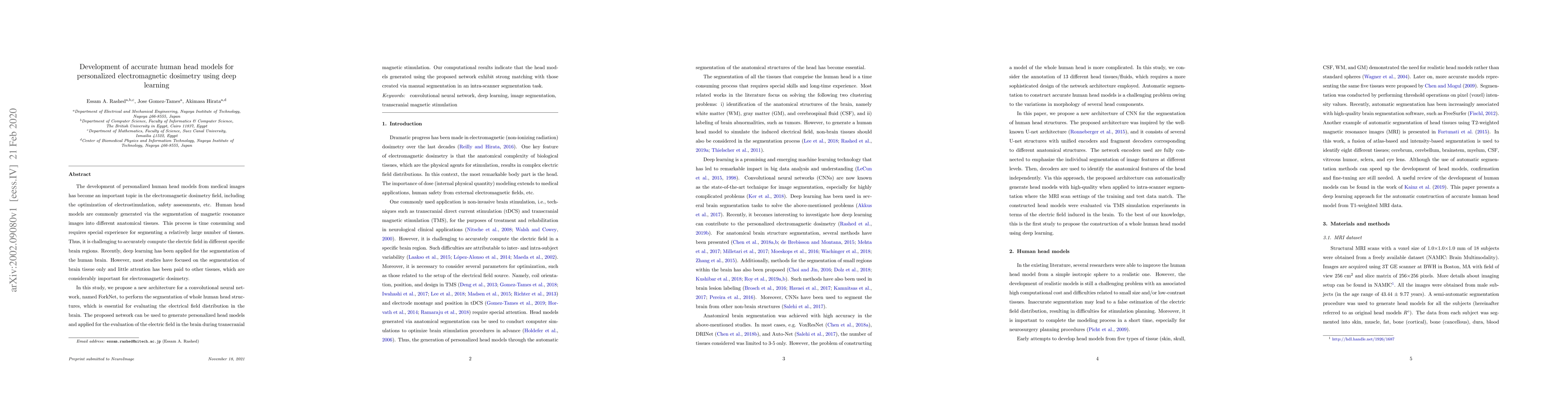 The development of personalized human head models from medical images has become an important topic in the electromagnetic dosimetry field, including the optimization of electrostimulation, safety assessments, etc. Human head models are commonly generated via the segmentation of magnetic resonance images into different anatomical tissues. This process is time consuming and requires special experience for segmenting a relatively large number of tissues. Thus, it is challenging to accurately compute the electric field in different specific brain regions. Recently, deep learning has been applied for the segmentation of the human brain. However, most studies have focused on the segmentation of brain tissue only and little attention has been paid to other tissues, which are considerably important for electromagnetic dosimetry. In this study, we propose a new architecture for a convolutional neural network, named ForkNet, to perform the segmentation of whole human head structures, which is essential for evaluating the electrical field distribution in the brain. The proposed network can be used to generate personalized head models and applied for the evaluation of the electric field in the brain during transcranial magnetic stimulation. Our computational results indicate that the head models generated using the proposed network exhibit strong matching with those created via manual segmentation in an intra-scanner segmentation task.