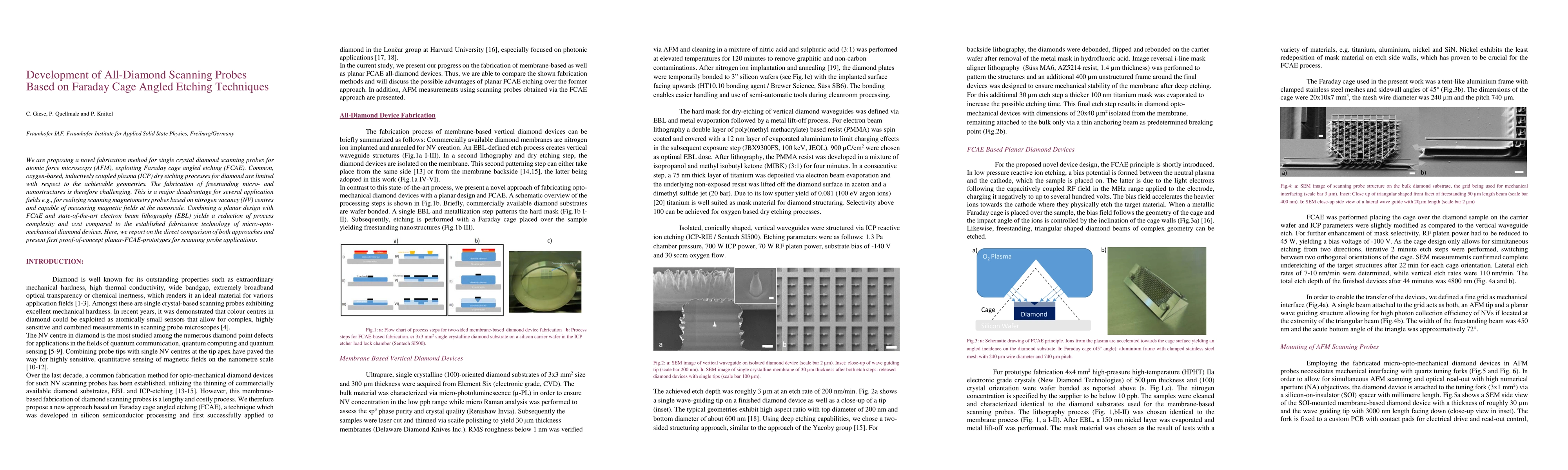 We are proposing a novel fabrication method for single crystal diamond scanning probes, exploiting the method of Faraday cage angled etching (FCAE). Electron-beam lithography (EBL) and inductively coupled plasma (ICP) etching as state-of-the-art method is often limiting the achievable diamond structure geometries in aspect ratio and complexity. This poses challenges, e.g., for realizing nitrogen vacancy (NV) centre magnetometry scanning probes. Combining a planar design with FCAE offers several advantages over the established fabrication technology of nano-opto-mechanical diamond devices. Here, we report on the direct comparison of both approaches and present first proof-of-concept FCAE-prototypes for scanning probe applications.