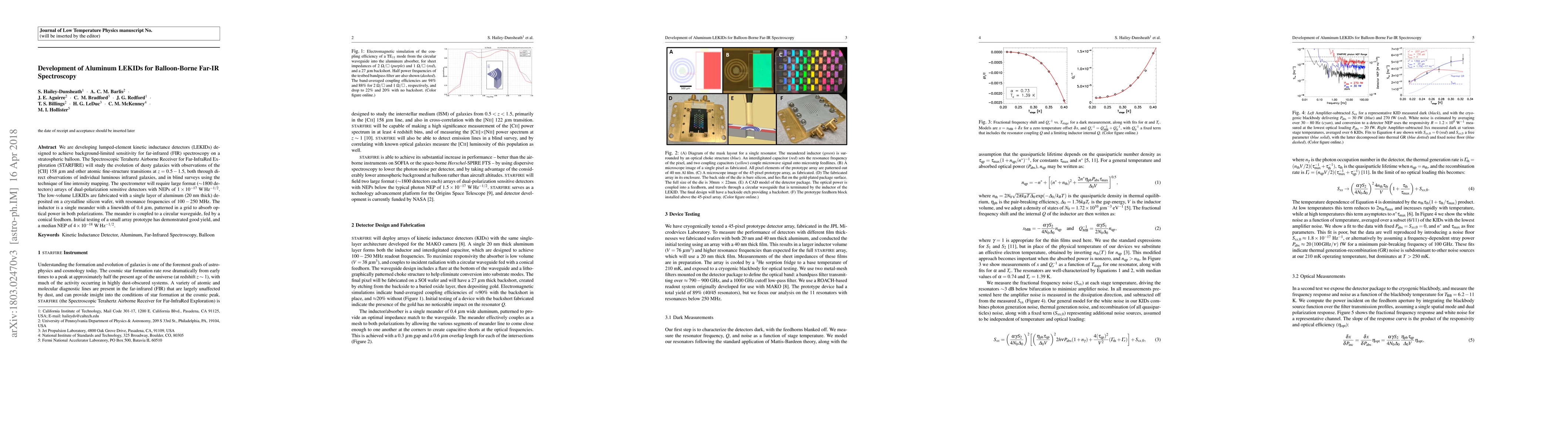 We are developing lumped-element kinetic inductance detectors (LEKIDs) designed to achieve background-limited sensitivity for far-infrared (FIR) spectroscopy on a stratospheric balloon. The Spectroscopic Terahertz Airborne Receiver for Far-InfraRed Exploration (STARFIRE) will study the evolution of dusty galaxies with observations of the [CII] 158 $\mu$m and other atomic fine-structure transitions at $z=0.5-1.5$, both through direct observations of individual luminous infrared galaxies, and in blind surveys using the technique of line intensity mapping. The spectrometer will require large format ($\sim$1800 detectors) arrays of dual-polarization sensitive detectors with NEPs of $1 \times 10^{-17}$ W Hz$^{-1/2}$. The low-volume LEKIDs are fabricated with a single layer of aluminum (20 nm thick) deposited on a crystalline silicon wafer, with resonance frequencies of $100-250$ MHz. The inductor is a single meander with a linewidth of 0.4 $\mu$m, patterned in a grid to absorb optical power in both polarizations. The meander is coupled to a circular waveguide, fed by a conical feedhorn. Initial testing of a small array prototype has demonstrated good yield, and a median NEP of $4 \times 10^{-18}$ W Hz$^{-1/2}$.