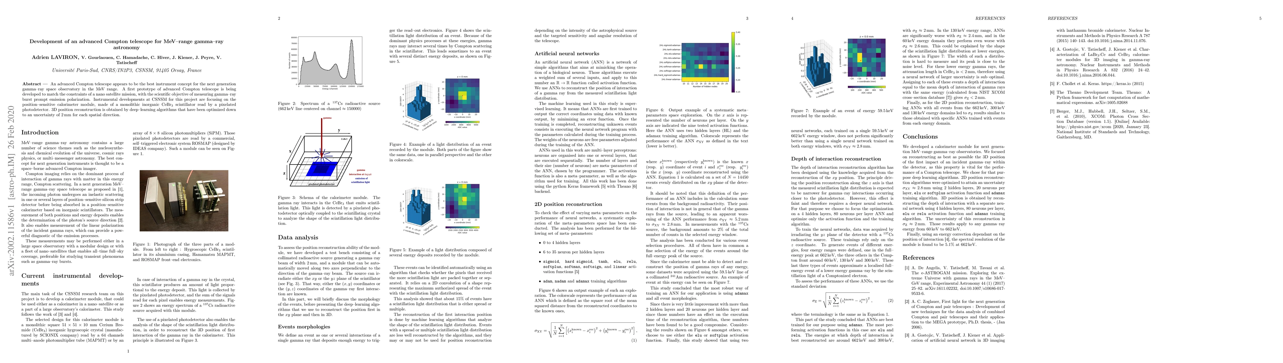 An advanced Compton telescope appears to be the best instrument concept for the next generation gamma-ray space observatory in the MeV range. A first prototype of advanced Compton telescope is being developed to match the constraints of a nano satellite mission, with the scientific objective of measuring gamma-ray burst prompt emission polarization. Our instrumental developments for this project are focusing on the position-sensitive calorimeter module, made of a monolithic inorganic CeBr$_3$ scintillator read by a pixelated photodetector. 3D position reconstruction is obtained by deep-learning algorithms that have been optimized down to an uncertainty of 2 mm for each spatial direction.