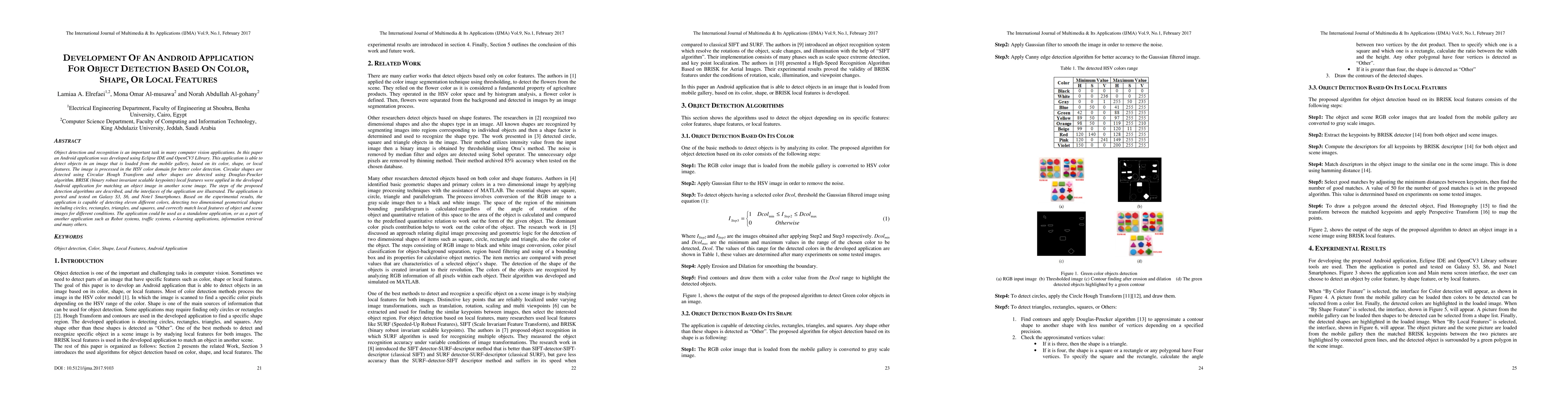 Object detection and recognition is an important task in many computer vision applications. In this paper an Android application was developed using Eclipse IDE and OpenCV3 Library. This application is able to detect objects in an image that is loaded from the mobile gallery, based on its color, shape, or local features. The image is processed in the HSV color domain for better color detection. Circular shapes are detected using Circular Hough Transform and other shapes are detected using Douglas-Peucker algorithm. BRISK (binary robust invariant scalable keypoints) local features were applied in the developed Android application for matching an object image in another scene image. The steps of the proposed detection algorithms are described, and the interfaces of the application are illustrated. The application is ported and tested on Galaxy S3, S6, and Note1 Smartphones. Based on the experimental results, the application is capable of detecting eleven different colors, detecting two dimensional geometrical shapes including circles, rectangles, triangles, and squares, and correctly match local features of object and scene images for different conditions. The application could be used as a standalone application, or as a part of another application such as Robot systems, traffic systems, e-learning applications, information retrieval and many others.