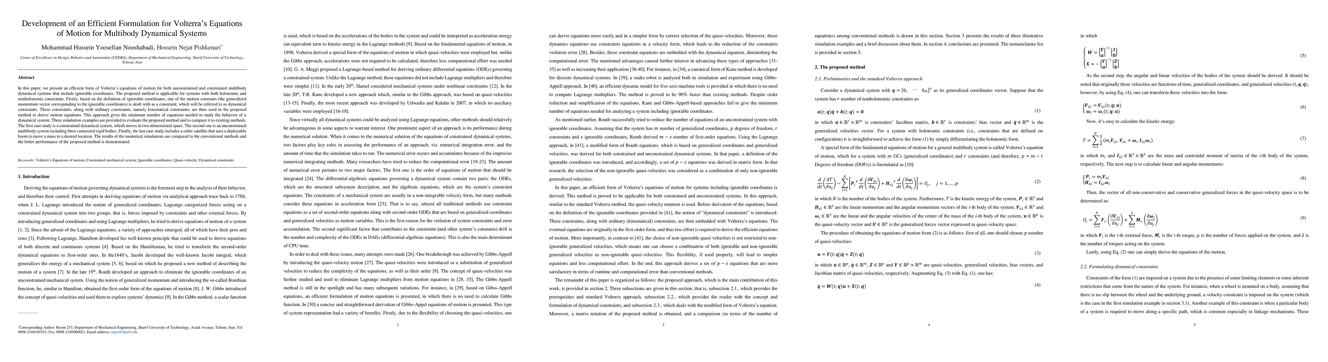 This paper develops an efficient formulation of Volterra's equations of motion for multibody dynamical systems, incorporating both holonomic and nonholonomic constraints. The method reduces the number of equations needed by treating dynamical constraints alongside kinematical constraints, and is demonstrated through three simulation examples showing superior performance compared to conventional methods.
