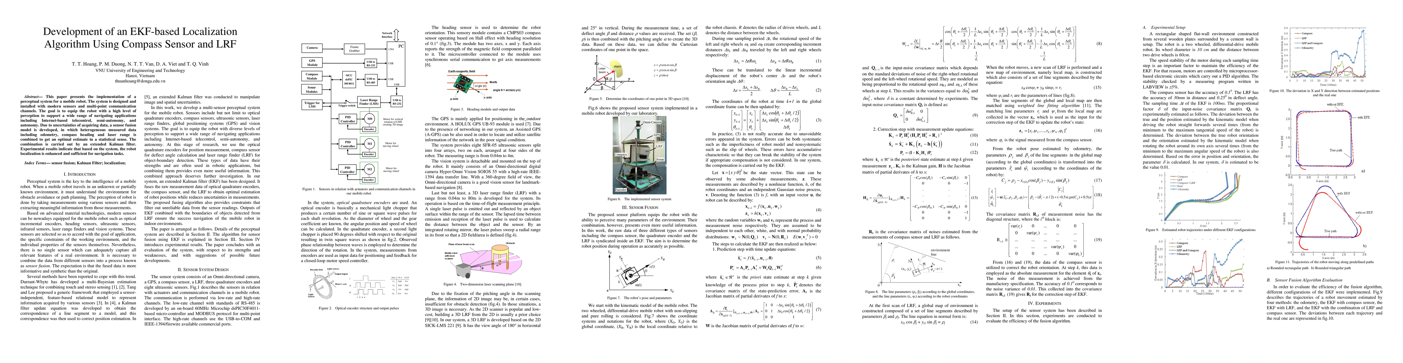 This paper presents the implementation of a perceptual system for a mobile robot. The system is designed and installed with modern sensors and multi-point communication channels. The goal is to equip the robot with a high level of perception to support a wide range of navigating applications including Internet-based telecontrol, semi-autonomy, and autonomy. Due to uncertainties of acquiring data, a sensor fusion model is developed, in which heterogeneous measured data including odometry, compass heading and laser range is combined to get an optimal estimate in a statistical sense. The combination is carried out by an extended Kalman filter. Experimental results indicate that based on the system, the robot localization is enhanced and sufficient for navigation tasks.