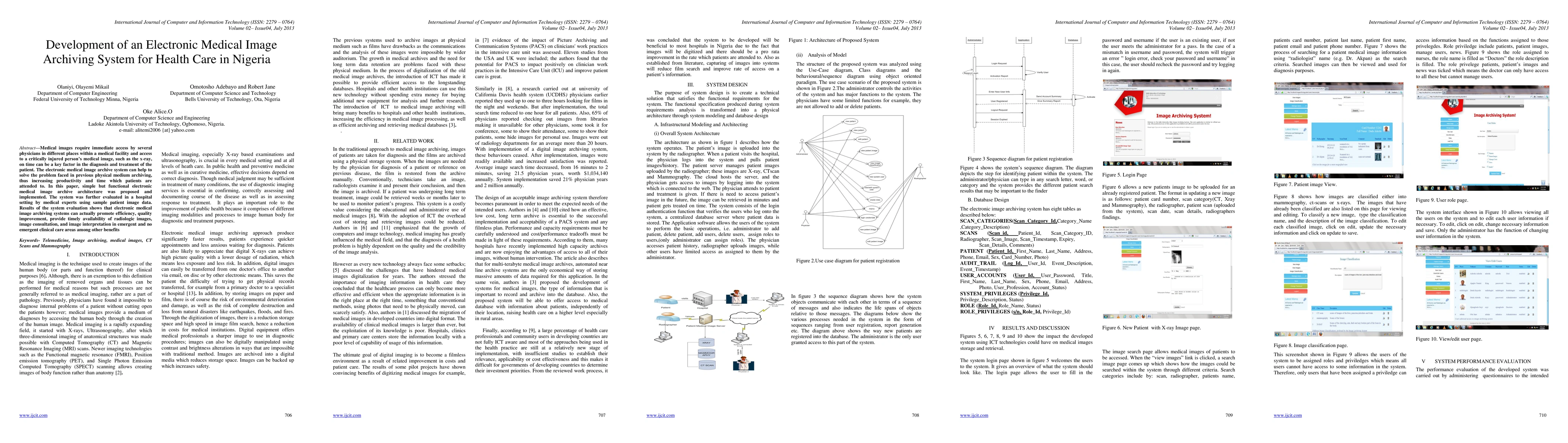 An electronic medical image archiving system was developed to improve efficiency and quality in Nigerian healthcare, promoting timely access to medical images for diagnosis and treatment. The system was evaluated with positive results, showing benefits including improved productivity, quality improvement, and enhanced patient care.