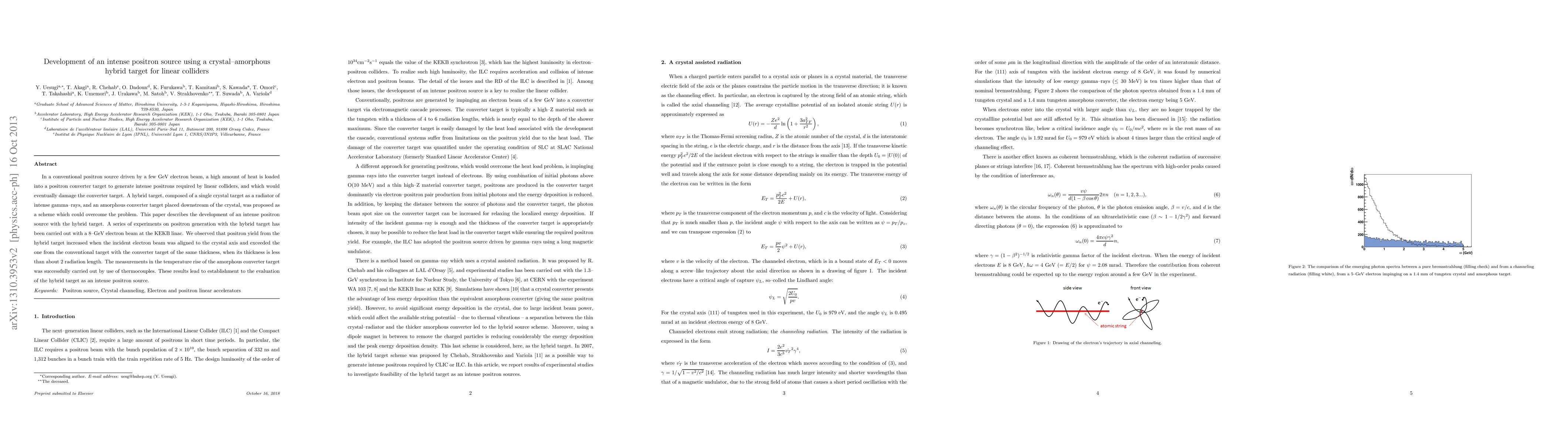 In a conventional positron source driven by a few GeV electron beam, a high amount of heat is loaded into a positron converter target to generate intense positrons required by linear colliders, and which would eventually damage the converter target. A hybrid target, composed of a single crystal target as a radiator of intense gamma--rays, and an amorphous converter target placed downstream of the crystal, was proposed as a scheme which could overcome the problem.This paper describes the development of an intense positron source with the hybrid target. A series of experiments on positron generation with the hybrid target has been carried out with a 8--GeV electron beam at the KEKB linac. We observed that positron yield from the hybrid target increased when the incident electron beam was aligned to the crystal axis and exceeded the one from the conventional target with the converter target of the same thickness, when its thickness is less than about 2 radiation length. The measurements in the temperature rise of the amorphous converter target was successfully carried out by use of thermocouples. These results lead to establishment to the evaluation of the hybrid target as an intense positron source.