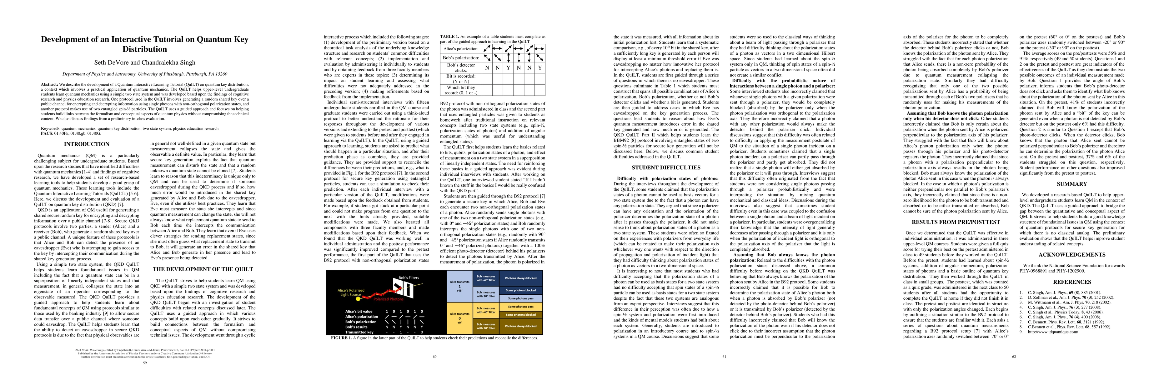 This paper details the creation of an interactive tutorial, QuILT, for teaching quantum key distribution to upper-level undergraduate students, emphasizing the connection between quantum mechanics formalism and conceptual understanding. Preliminary evaluations show positive initial feedback on the tutorial's effectiveness.