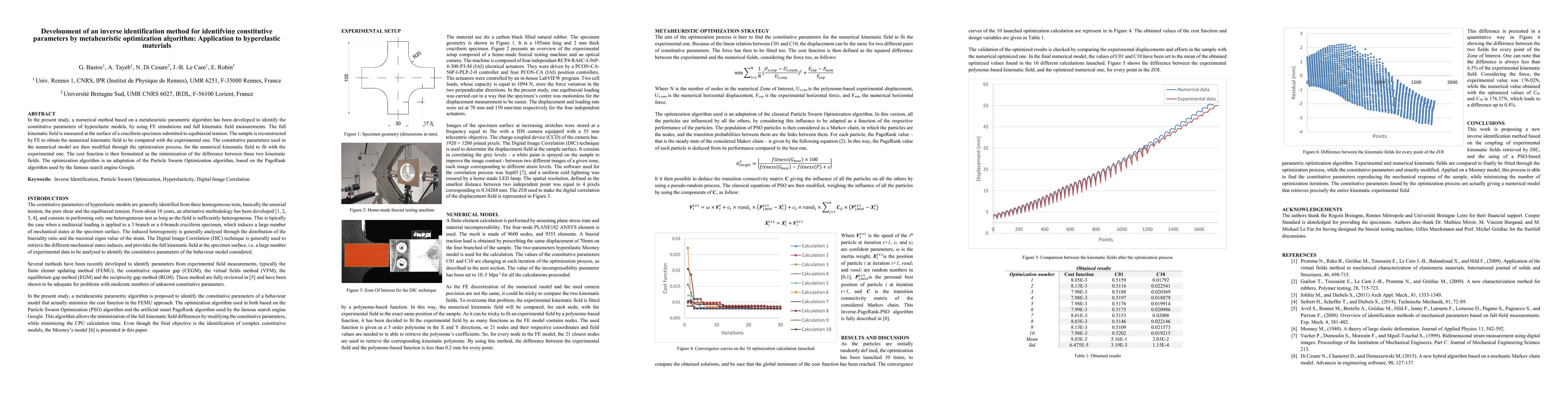 In the present study, a numerical method based on a metaheuristic parametric algorithm has been developed to identify the constitutive parameters of hyperelastic models, by using FE simulations and full kinematic field measurements. The full kinematic field is measured at the surface of a cruciform specimen submitted to equibiaxial tension. The sample is reconstructed by FE to obtain the numerical kinematic field to be compared with the experimental one. The constitutive parameters used in the numerical model are then modified through the optimization process, for the numerical kinematic field to fit with the experimental one. The cost function is then formulated as the minimization of the difference between these two kinematic fields. The optimization algorithm is an adaptation of the Particle Swarm Optimization algorithm, based on the PageRank algorithm used by the famous search engine Google. INTRODUCTION The constitutive parameters of hyperelastic models are generally identified from three homogeneous tests, basically the uniaxial tension, the pure shear and the equibiaxial tension. From about 10 years, an alternative methodology has been developed [1, 2, 3, 4], and consists in performing only one heterogeneous test as long as the field is sufficiently heterogeneous. This is tipically the case when a multiaxial loading is applied to a 3 branch or a 4-branch cruciform specimen, which induces a large number of mechanical states at the specimen surface. The induced heterogeneity is generally analysed through the distribution of the biaxiality ratio and the maximal eigen value of the strain. The Digital Image Correlation (DIC) technique is generally used to retrieve the different mechanical states induces, and provides the full kinematic field at the specimen surface, i.e. a large number of experimental data to be analysed to identify the constitutive parameters of the behaviour model considered.