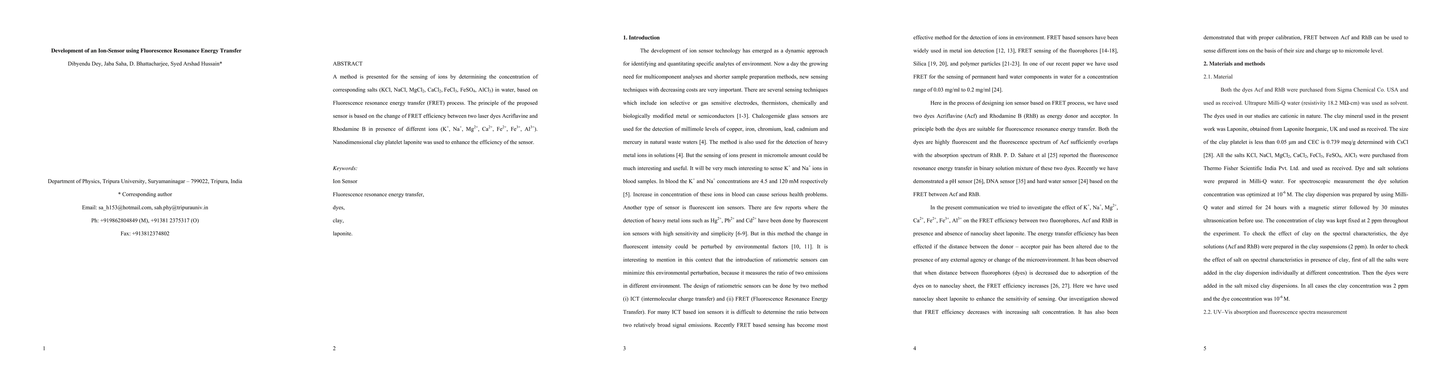 This paper develops an ion-sensor using fluorescence resonance energy transfer (FRET) to detect various ions in water by measuring changes in FRET efficiency between Acriflavine and Rhodamine B, with laponite clay enhancing sensor performance.
