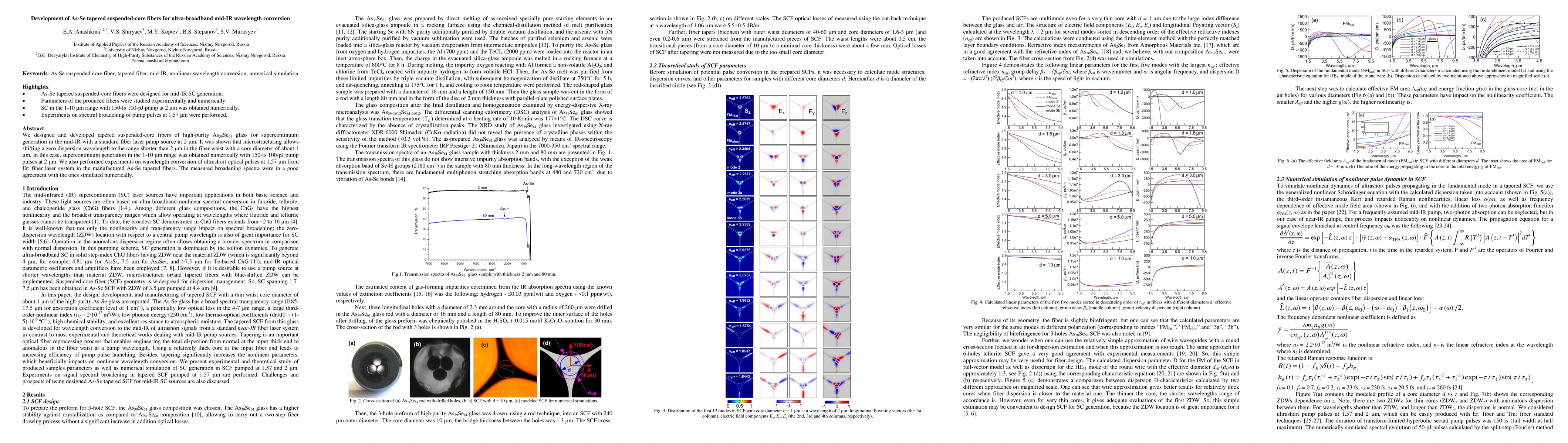 This paper details the development of high-purity As39Se61 glass tapered suspended-core fibers for ultra-broadband mid-IR supercontinuum generation, achieving spectral broadening from 1-10 μm using 2 μm pump pulses. Experimental results confirmed the numerical simulations of wavelength conversion and supercontinuum generation.