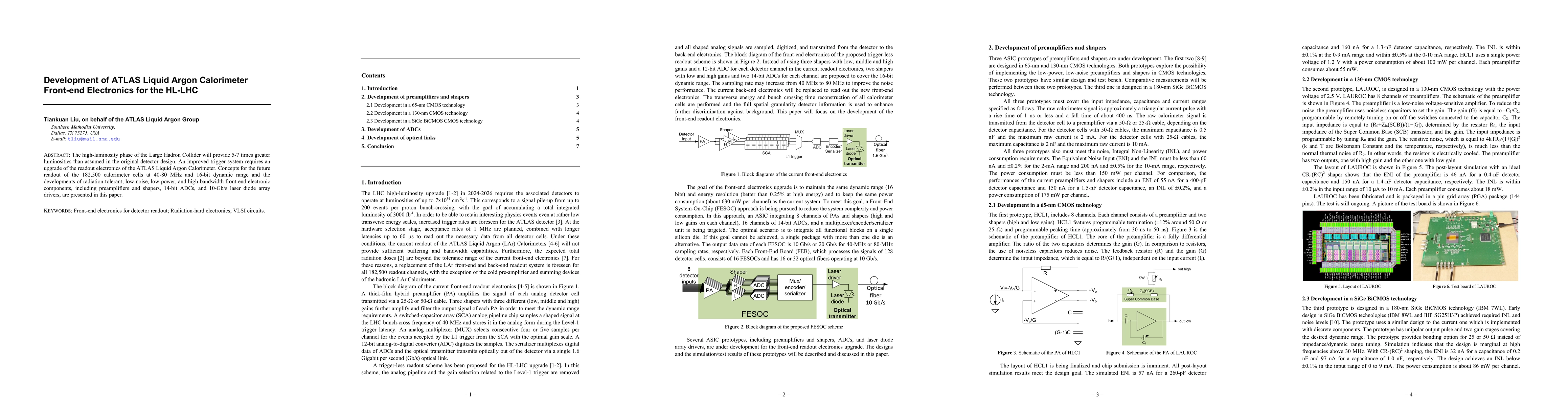 This paper details the development of advanced front-end electronics for the ATLAS Liquid Argon Calorimeter to meet the increased data rates and dynamic range requirements of the HL-LHC, focusing on radiation-tolerant, low-noise, and high-bandwidth components. It outlines the design and implementation of preamplifiers, shapers, ADCs, and laser diode drivers for the upgraded readout system.