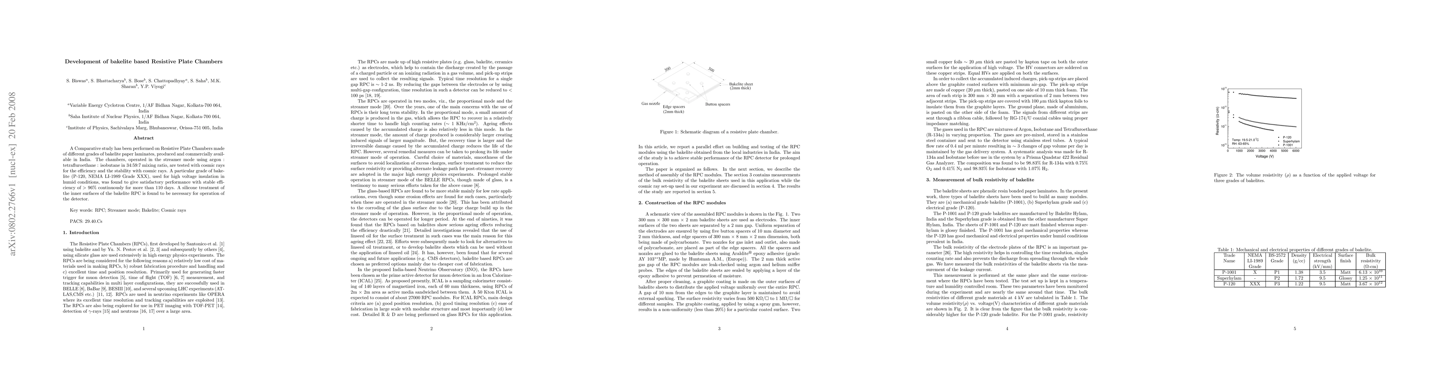 This study compares the performance of Resistive Plate Chambers made from various grades of bakelite paper laminates, finding that a specific grade (P-120) offers stable efficiency over 96% for over 110 days when exposed to cosmic rays. Silicone treatment of the inner surfaces is essential for optimal detector operation.
