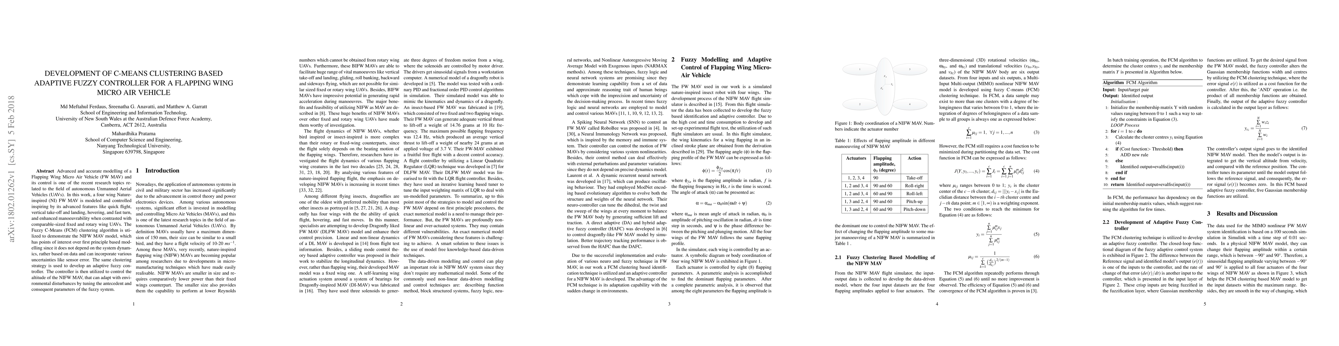 This paper develops a c-means clustering based adaptive fuzzy controller for a Nature-inspired Flapping Wing Micro Air Vehicle (NIFW MAV), focusing on its advanced flight features. The Fuzzy C-Means (FCM) algorithm is used to model the NIFW MAV and to create an adaptive fuzzy controller that adjusts to environmental disturbances.