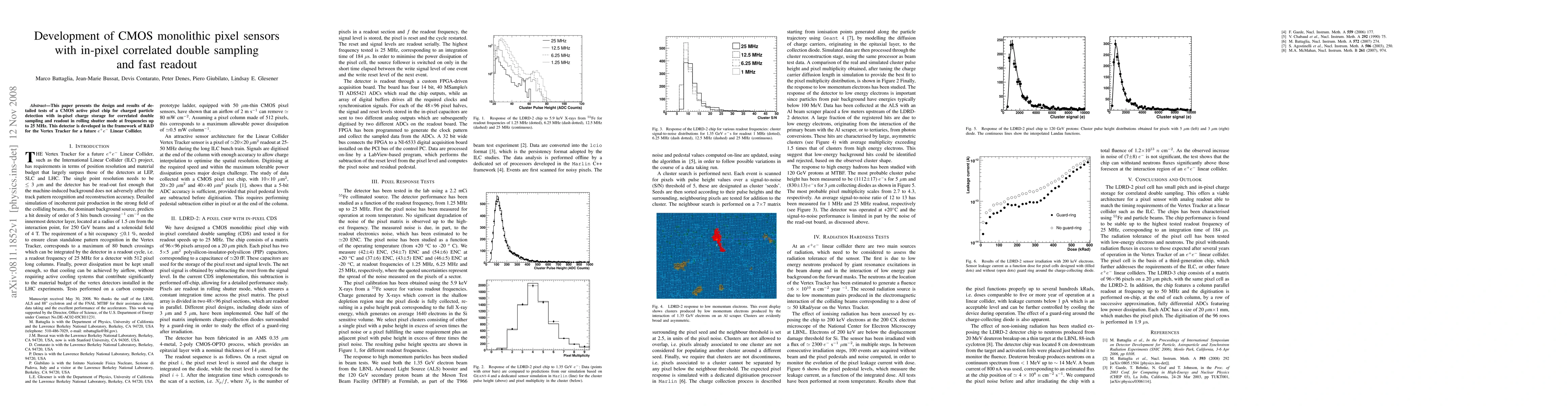 This paper details the design and testing of a CMOS monolithic pixel sensor featuring in-pixel correlated double sampling and fast rolling shutter readout up to 25 MHz, aimed at charged particle detection for the Vertex Tracker in a future e+e- Linear Collider. The sensor demonstrates effective performance in high-frequency applications.