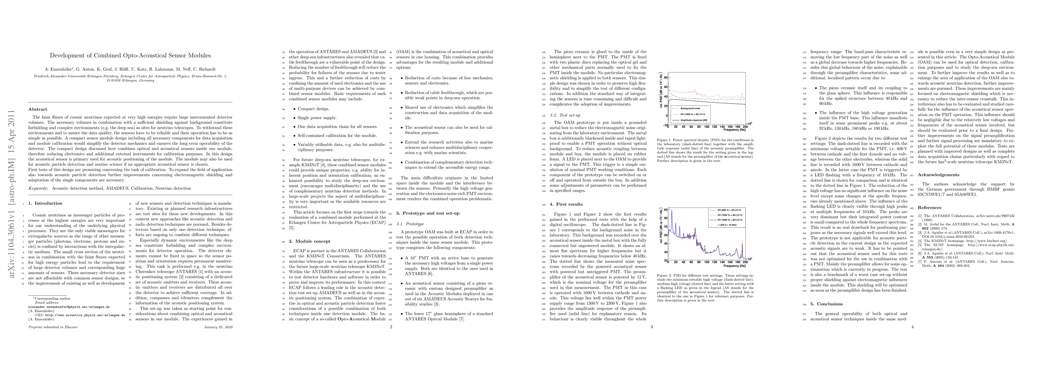 This paper presents a compact opto-acoustical sensor module designed to simplify the mechanics and ensure long-term operability of neutrino telescopes in challenging environments. Initial tests show promising results for calibration, though further improvements are needed for broader applications in acoustic particle detection.