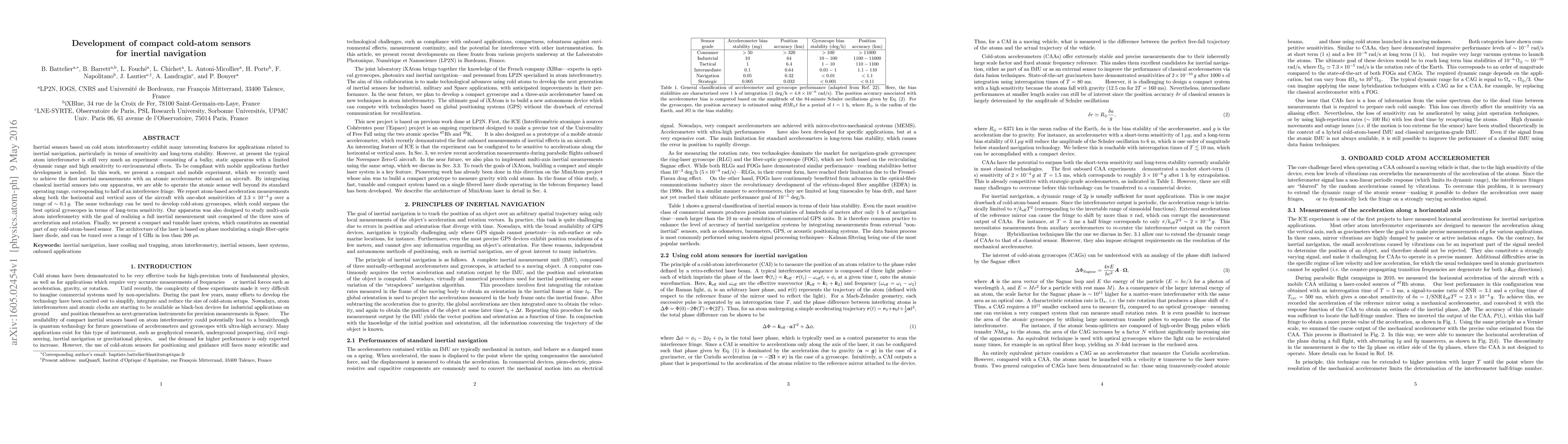 This paper details the development of a compact cold-atom sensor for inertial navigation, achieving inertial measurements on an aircraft with high sensitivity and stability. The authors integrate classical sensors to extend the atomic accelerometer's range and propose the potential for cold-atom gyroscopes to outperform optical gyroscopes in long-term sensitivity.
