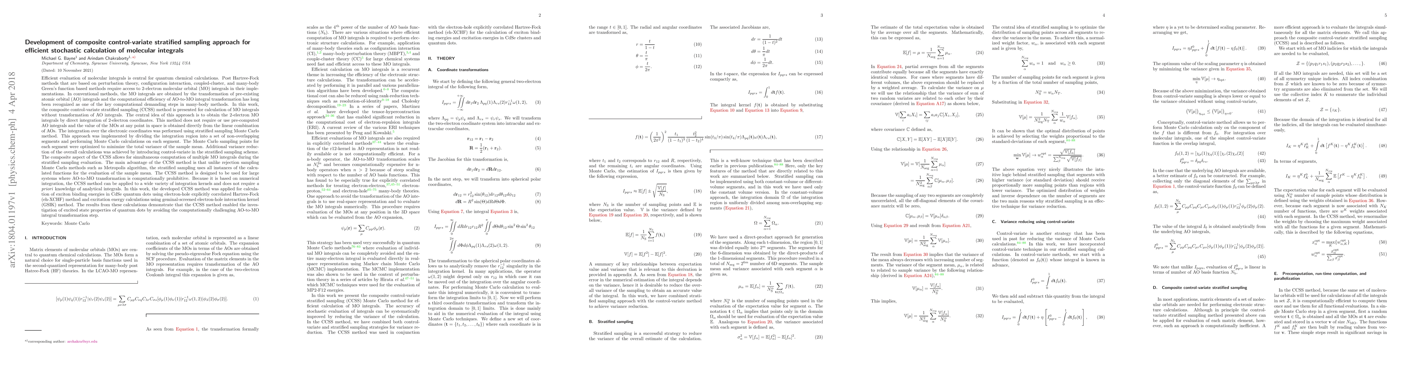 The paper introduces the composite control-variate stratified sampling (CCSS) method for efficient stochastic calculation of molecular integrals, bypassing the need for AO-to-MO transformations. This method uses stratified sampling Monte Carlo to integrate molecular orbital (MO) integrals directly from atomic orbitals (AOs), optimizing sampling points to minimize variance and employing control-variates for additional variance reduction.
