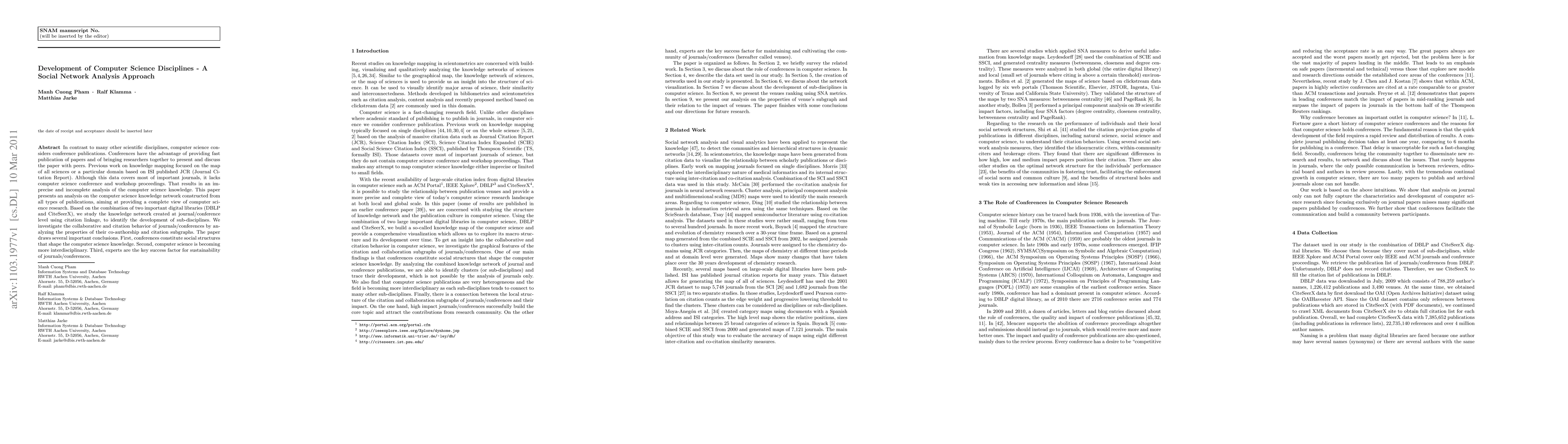 This paper uses social network analysis to examine the development of computer science disciplines by mapping the knowledge network from both journal and conference publications. It highlights the role of conferences in shaping computer science, the increasing interdisciplinary nature of the field, and the importance of expert contributions for the sustainability of journals and conferences.