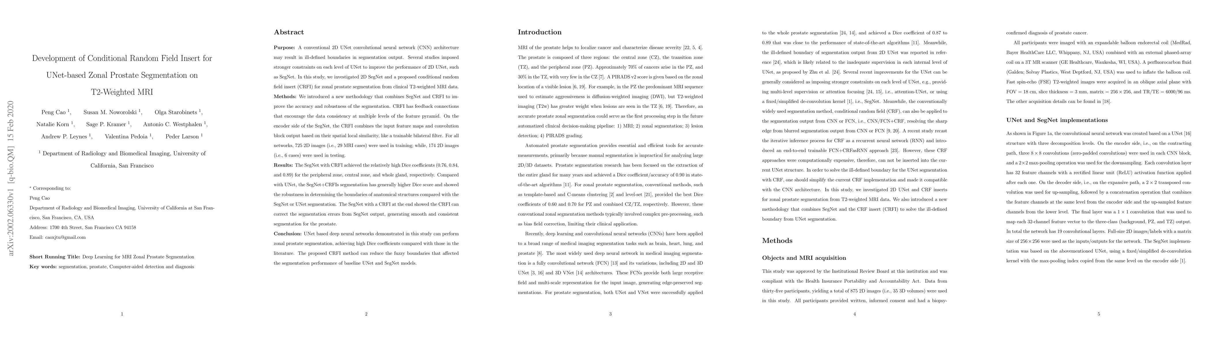 This study proposes a conditional random field insert (CRFI) combined with SegNet to enhance zonal prostate segmentation in T2-weighted MRI, achieving higher Dice coefficients (0.76-0.89) compared to UNet and SegNet alone, demonstrating improved boundary definition and segmentation accuracy.