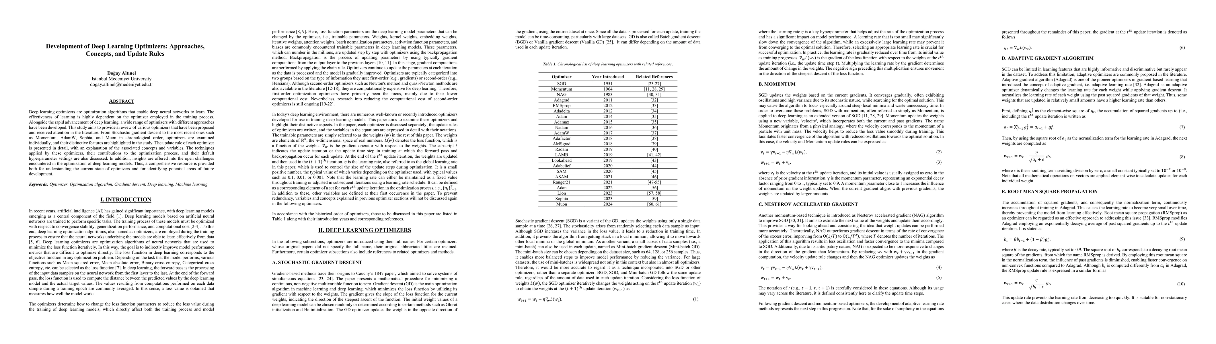Deep learning optimizers are optimization algorithms that enable deep neural networks to learn. The effectiveness of learning is highly dependent on the optimizer employed in the training process. Alongside the rapid advancement of deep learning, a wide range of optimizers with different approaches have been developed. This study aims to provide a review of various optimizers that have been proposed and received attention in the literature. From Stochastic gradient descent to the most recent ones such as Momentum, AdamW, Sophia, and Muon in chronological order, optimizers are examined individually, and their distinctive features are highlighted in the study. The update rule of each optimizer is presented in detail, with an explanation of the associated concepts and variables. The techniques applied by these optimizers, their contributions to the optimization process, and their default hyperparameter settings are also discussed. In addition, insights are offered into the open challenges encountered in the optimization of deep learning models. Thus, a comprehensive resource is provided both for understanding the current state of optimizers and for identifying potential areas of future development.