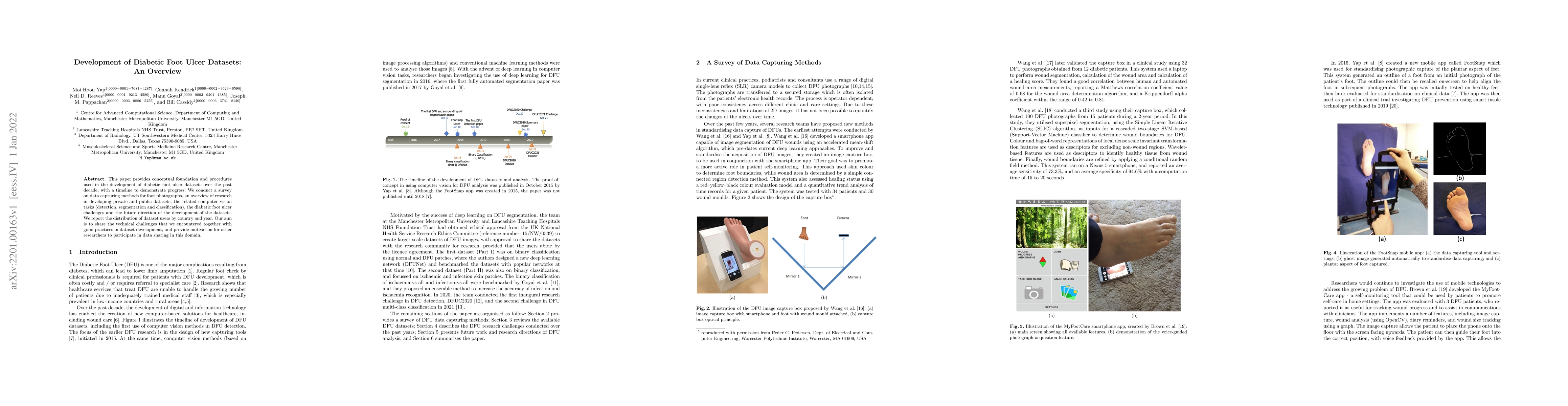 This paper provides conceptual foundation and procedures used in the development of diabetic foot ulcer datasets over the past decade, with a timeline to demonstrate progress. We conduct a survey on data capturing methods for foot photographs, an overview of research in developing private and public datasets, the related computer vision tasks (detection, segmentation and classification), the diabetic foot ulcer challenges and the future direction of the development of the datasets. We report the distribution of dataset users by country and year. Our aim is to share the technical challenges that we encountered together with good practices in dataset development, and provide motivation for other researchers to participate in data sharing in this domain.