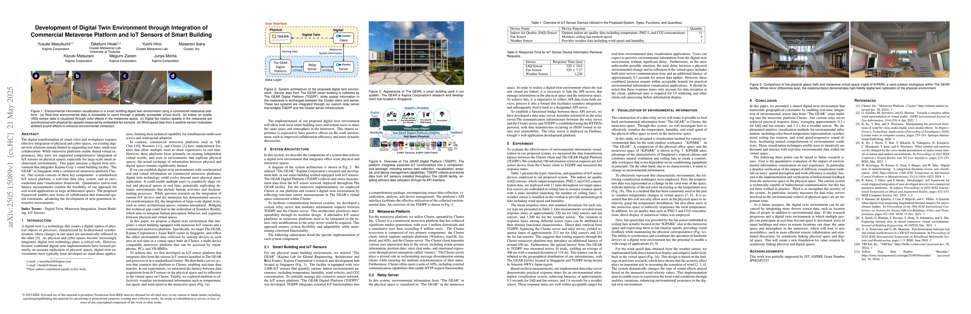 The paper presents a digital twin environment developed by integrating Kajima Corp.'s smart building 'The GEAR' in Singapore with the commercial metaverse platform Cluster. The system comprises a standardized IoT sensor platform, a real-time data relay system, and an environmental data visualization framework.