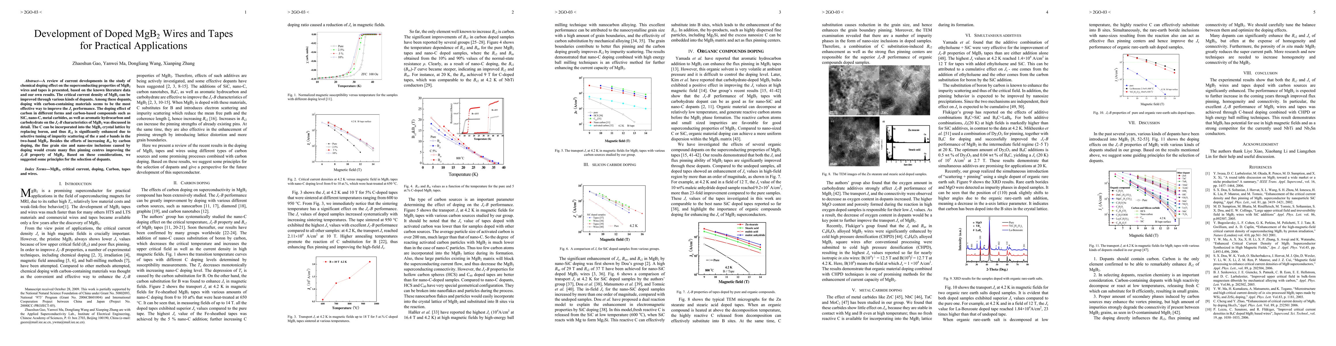 A review of current developments in the study of chemical doping effect on the superconducting properties of MgB2 wires and tapes is presented, based on the known literature data and our own results. The critical current density of MgB2 can be improved through various kinds of dopants. Among these dopants, doping with carbon-containing materials seems to be the most effective way to improve the Jc performance. The doping effect of carbon in different forms and carbon-based compounds such as SiC, nano-C, metal carbides, as well as aromatic hydrocarbon and carbohydrate on the Jc-B characteristics of MgB2 was discussed in detail. The C can be incorporated into the MgB2 crystal lattice by replacing boron, and thus Bc2 is significantly enhanced due to selective tuning of impurity scattering of two bands in the two-band MgB2. Besides the efforts of increasing Bc2 by carbon doping, the fine grain size and nano-size inclusions caused by doping would create many flux pinning centres improving the Jc-B property of MgB2. Based on these considerations, we suggested some principles for the selection of dopants.