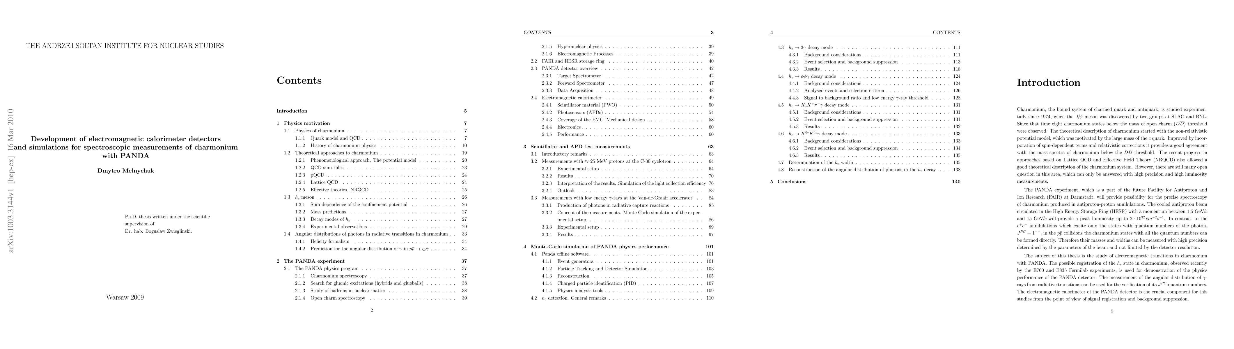 The subject of the thesis is the study of electromagnetic transitions in charmonium with PANDA. The possible registration of the $h_c$ state in charmonium, observed recently by the E760 and E835 Fermilab experiments, is used for demonstration of the physics performance of the PANDA detector. The measurement of the angular distribution of $\gamma$-rays from radiative transitions can be used for the verification of its $J^{PC}$ quantum numbers. The electromagnetic calorimeter of the PANDA detector is the crucial component for this studies from the point of view of signal registration and background suppression.