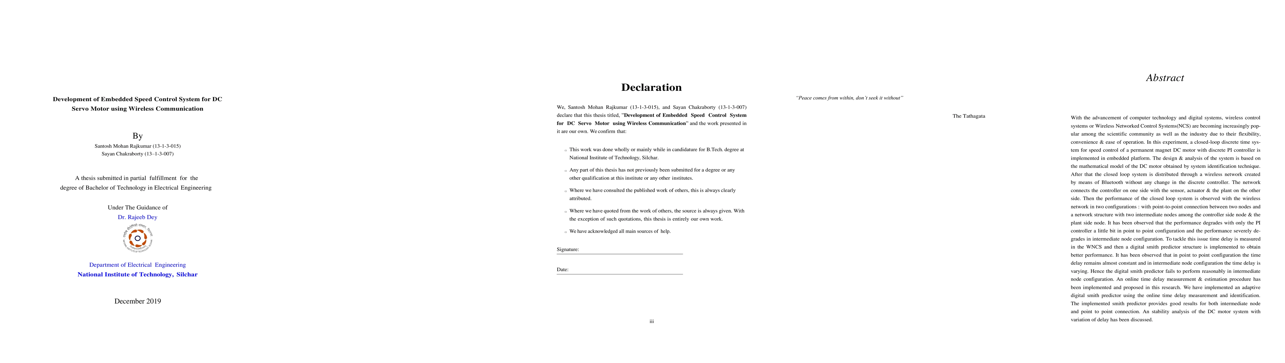 This research develops an embedded speed control system for a DC servo motor using wireless communication, implementing a discrete PI controller in a closed-loop system. The system's performance degrades over wireless networks, especially with intermediate nodes, due to time delays. An adaptive digital Smith predictor with online time delay measurement improves performance in both point-to-point and intermediate node configurations.