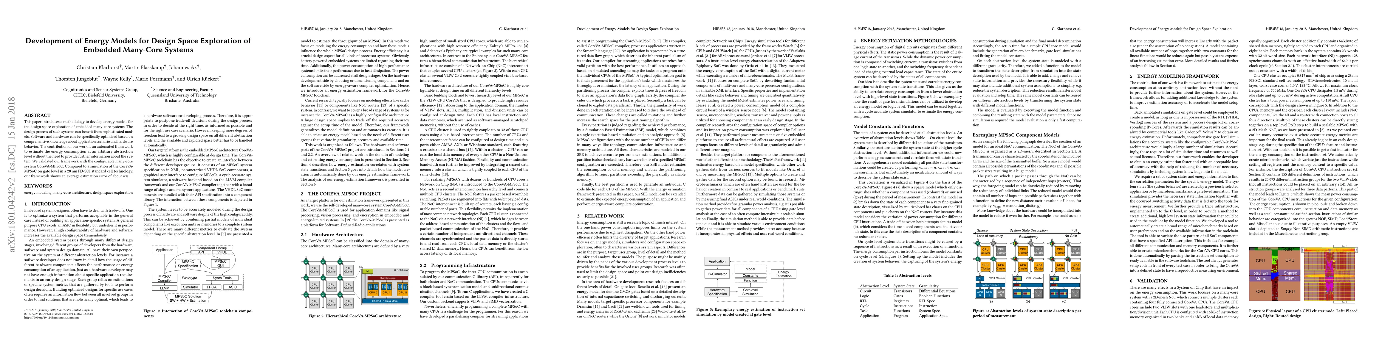 This paper presents an automated framework for estimating energy consumption in embedded many-core systems at any abstraction level, validated with the CoreVA-MPSoC system, showing an average estimation error of 4% compared to gate-level simulations. The framework aims to optimize both software and hardware based on comprehensive system knowledge.