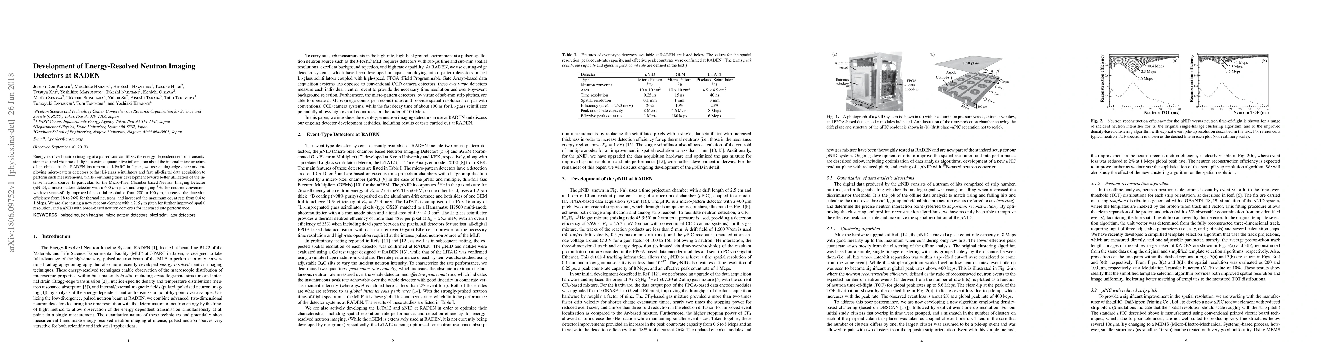 The RADEN instrument at J-PARC has developed advanced energy-resolved neutron imaging detectors, notably improving the Micro-Pixel Chamber based Neutron Imaging Detector's spatial resolution, detection efficiency, and maximum count rate. Future developments aim for even higher resolution and performance.