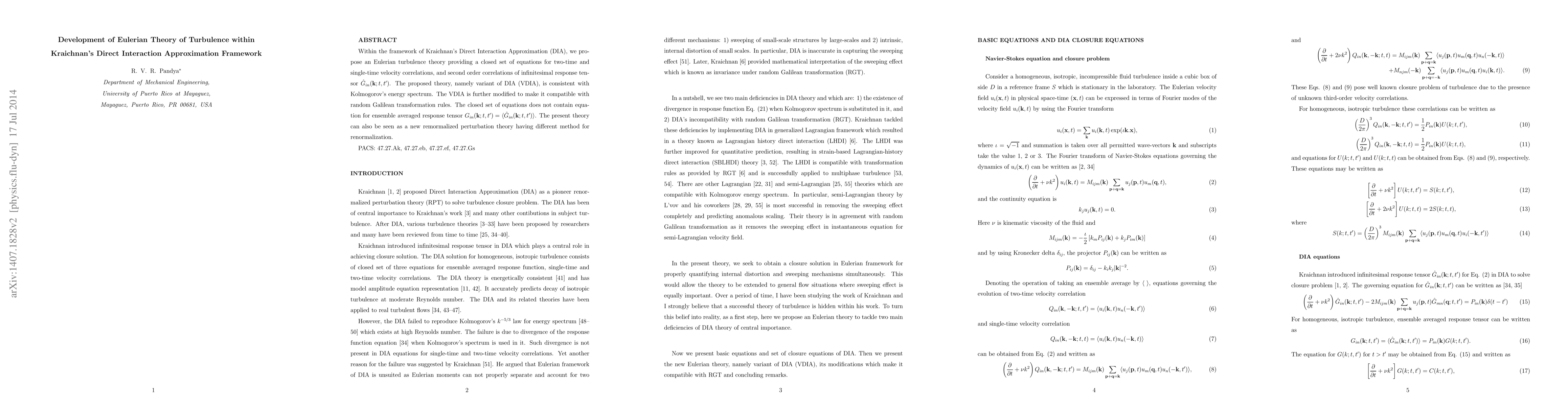 This paper develops an Eulerian turbulence theory within Kraichnan's Direct Interaction Approximation (DIA) framework, proposing a closed set of equations for velocity correlations and second-order correlations. The variant of DIA (VDIA) aligns with Kolmogorov's energy spectrum and is modified to comply with random Galilean transformations.