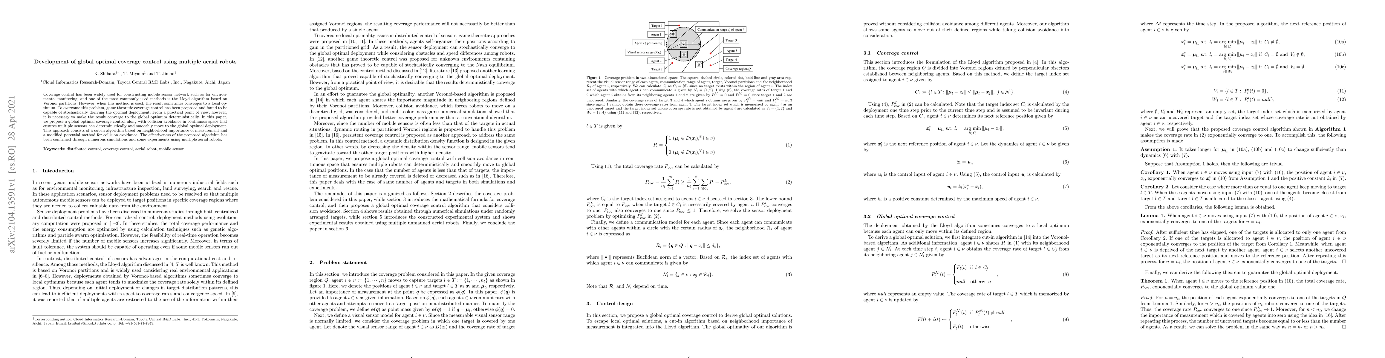 This paper proposes a global optimal coverage control method for multiple aerial robots, ensuring deterministic convergence to the global optimum using a cut-in algorithm and a modified potential method for collision avoidance. The approach is validated through simulations and experiments.