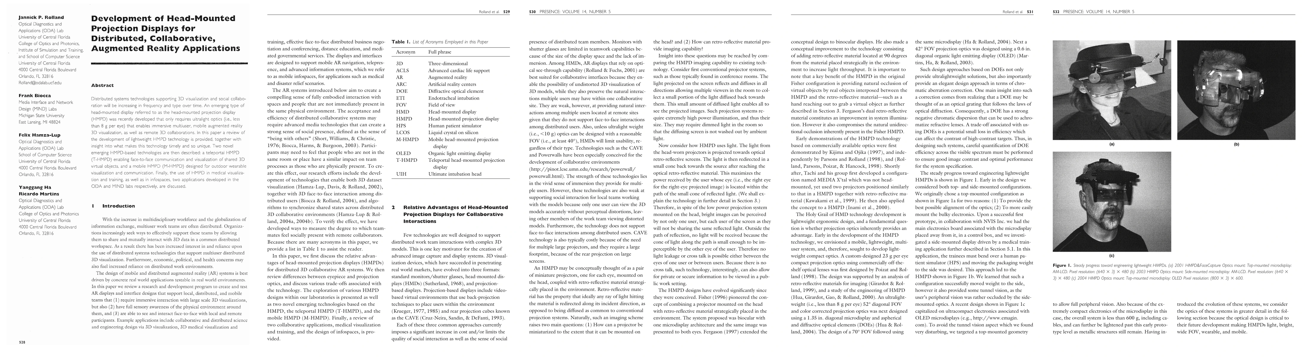 This paper reviews the development of lightweight head-mounted projection displays (HMPD) for immersive, collaborative, augmented reality applications, emphasizing their ultralight optics and novel uses in teleportation-based communication and mobile outdoor visualization. It also explores their applications in medical training and infospaces.
