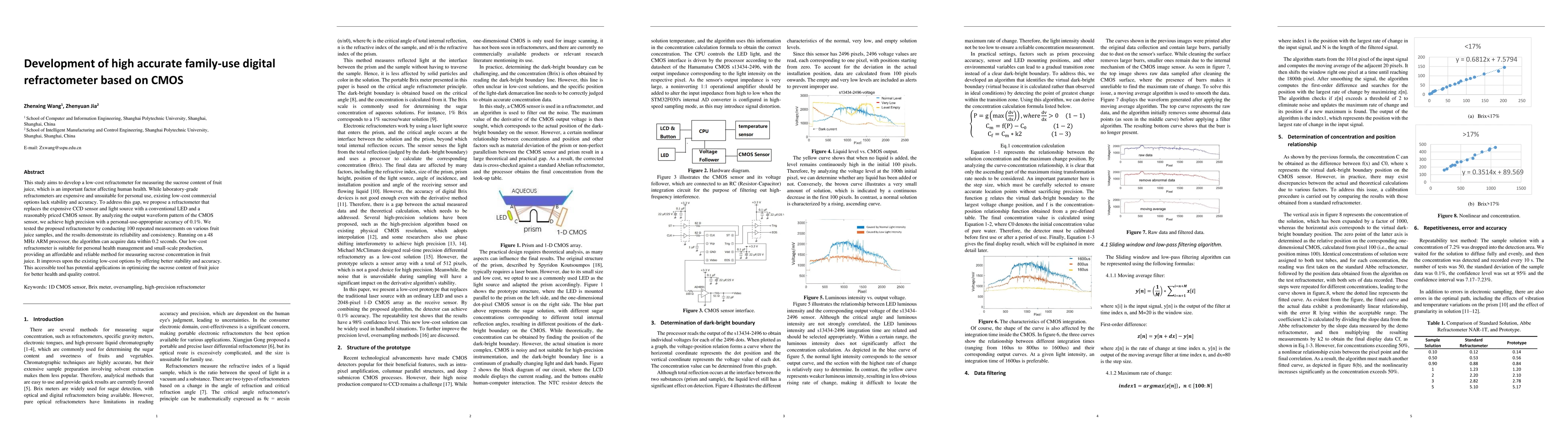 This study developed a low-cost, high-accuracy CMOS-based refractometer for measuring sucrose content in fruit juice, addressing the limitations of existing low-cost models in terms of stability and accuracy. The proposed device, running on a 48 MHz ARM processor, offers reliable and consistent results suitable for personal health management and small-scale production.