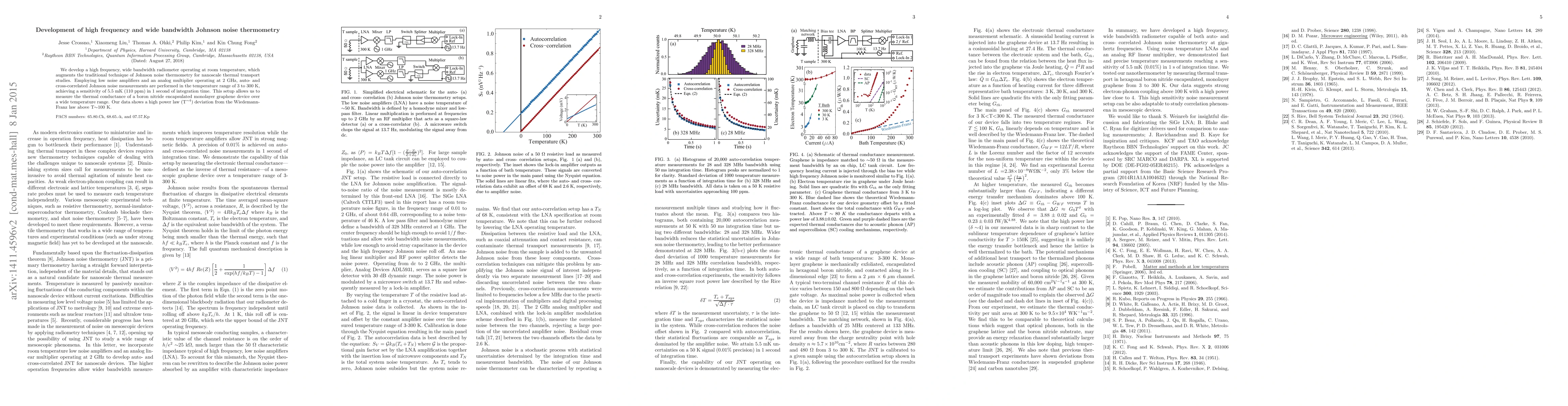 We develop a high frequency, wide bandwidth radiometer operating at room temperature, which augments the traditional technique of Johnson noise thermometry for nanoscale thermal transport studies. Employing low noise amplifiers and an analog multiplier operating at 2~GHz, auto- and cross-correlated Johnson noise measurements are performed in the temperature range of 3 to 300~K, achieving a sensitivity of 5.5~mK (110 ppm) in 1 second of integration time. This setup allows us to measure the thermal conductance of a boron nitride encapsulated monolayer graphene device over a wide temperature range. Our data shows a high power law (T$^{\sim4}$) deviation from the Wiedemann-Franz law above T$\sim$100~K.