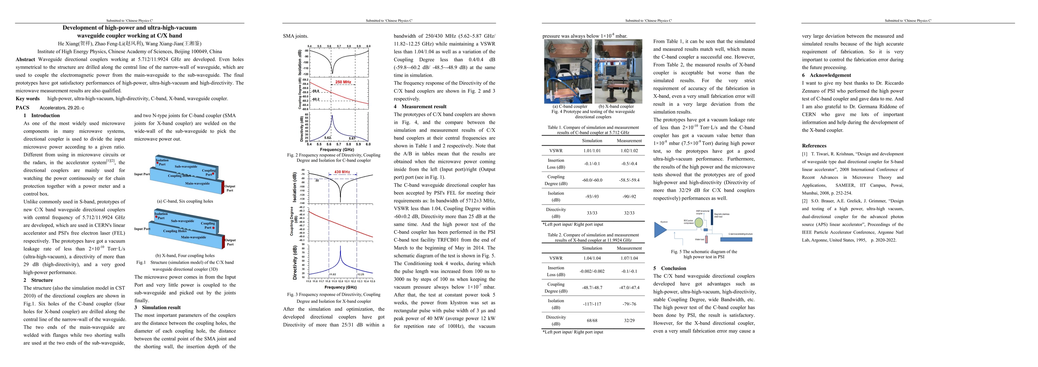 Waveguide directional couplers working at 5.712/11.9924 GHz are developed. Even holes symmetrical to the structure are drilled along the central line of the narrow-wall of waveguide, which are used to couple the electromagnetic power from the main-waveguide to the sub-waveguide. The final prototypes have got satisfactory performances of high-power, ultra-high-vacuum and high-directivity. The microwave measurement results are also qualified.