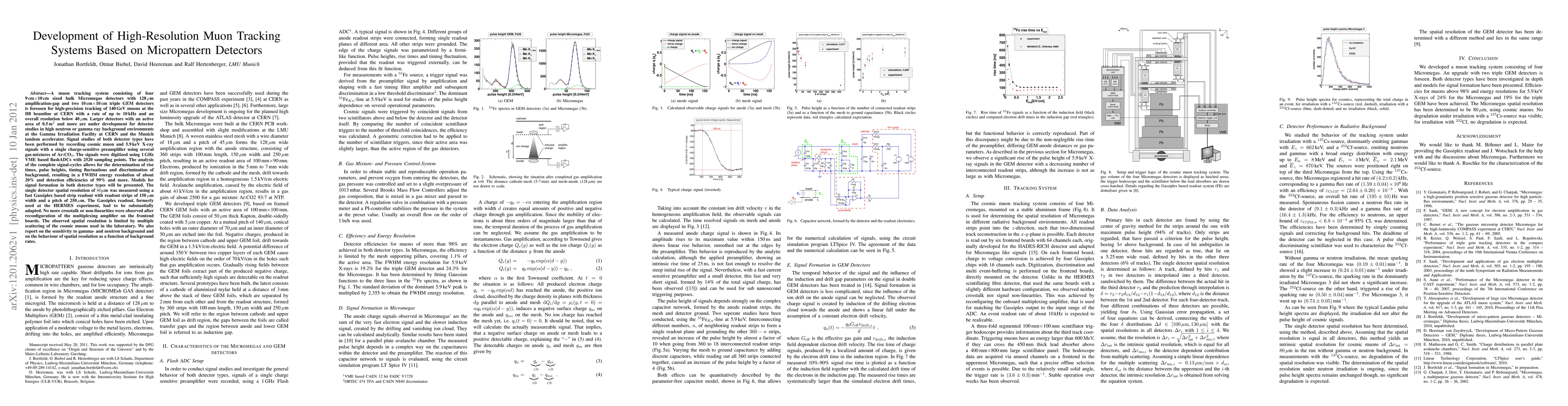 A muon tracking system consisting of four 9cm x 10cm sized bulk Micromegas detectors with 128um amplification-gap and two 10cm x 10cm triple GEM detectors is foreseen for high-precision tracking of 140GeV muons at the H8 beamline at CERN with a rate of up to 10kHz and an overall resolution below 40um. Larger detectors with an active area of 0.5m^2 and more are under development for detector studies in high neutron or gamma ray background environments at the Gamma Irradiation Facility at CERN and the Munich tandem accelerator. Signal studies of both detector types have been performed by recording cosmic muon and 5.9keV X-ray signals with a single charge-sensitive preamplifier using several gas-mixtures of Ar:CO_2. The signals were digitized using 1GHz VME based flashADCs with 2520 sampling points. The analysis of the complete signal-cycles allows for the determination of rise times, pulse heights, timing fluctuations and discrimination of background, resulting in a FWHM energy resolution of about 20% and detection efficiencies of 99% and more. Models for signal formation in both detector types will be presented. The single detector spatial resolution of 80um was measured using a fast Gassiplex based strip readout with readout strips of 150um width and a pitch of 250um. The Gassiplex readout, formerly used at the HERMES experiment, had to be substantially adapted. No more crosstalk or non-linearities were observed after reconfiguration of the multiplexing amplifier on the frontend boards. The observed spatial resolution is limited by multiple scattering of the cosmic muons used in the laboratory. We also report on the sensitivity to gamma- and neutron background and on the behaviour of spatial resolution as a function of background rates.