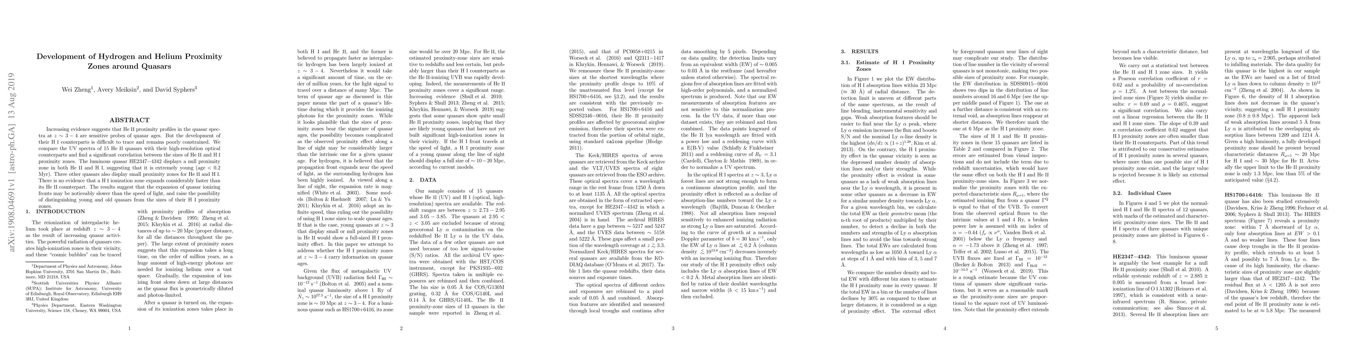 This study investigates the development of hydrogen and helium proximity zones around quasars at high redshifts, revealing a significant correlation between the sizes of He II and H I zones. The findings suggest that quasar ionizing fronts expand slower than light, and the sizes of H I zones may help distinguish young from old quasars.