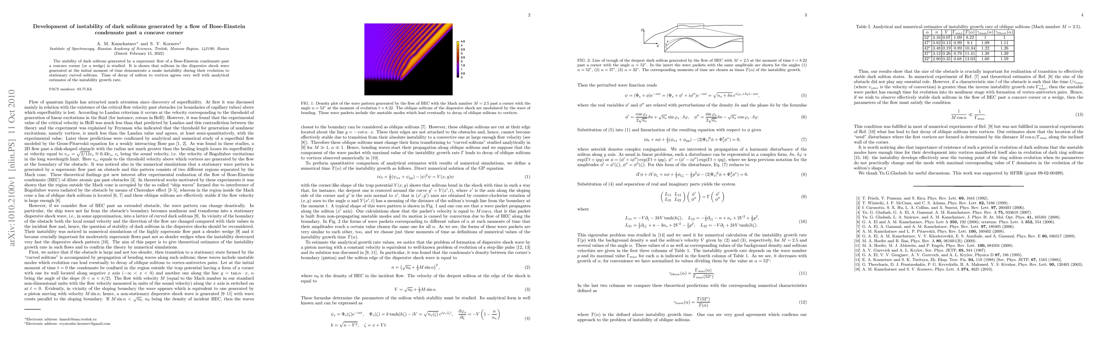 This paper investigates the instability of dark solitons formed by a supersonic flow of Bose-Einstein condensate around a concave corner, revealing a "snake instability" that leads to soliton decay into vortices, with the decay time matching analytical predictions.
