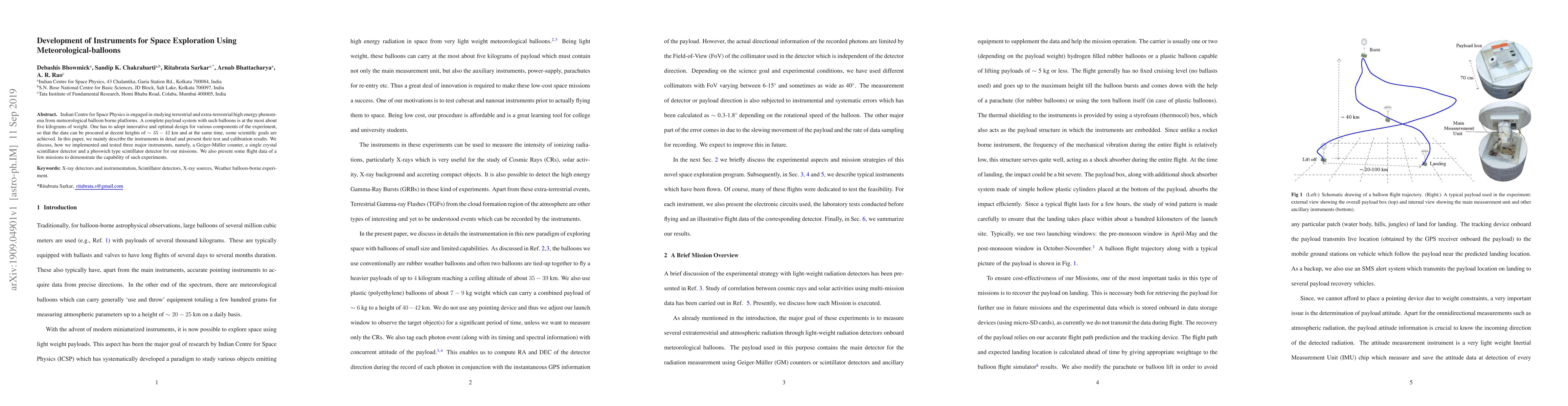 Researchers developed instruments for space exploration using meteorological balloons, achieving data collection at high altitudes while meeting scientific goals. Their test results showcase the effectiveness of Geiger-Muller counters, scintillator detectors, and phoswich type scintillators in extraterrestrial phenomena studies.