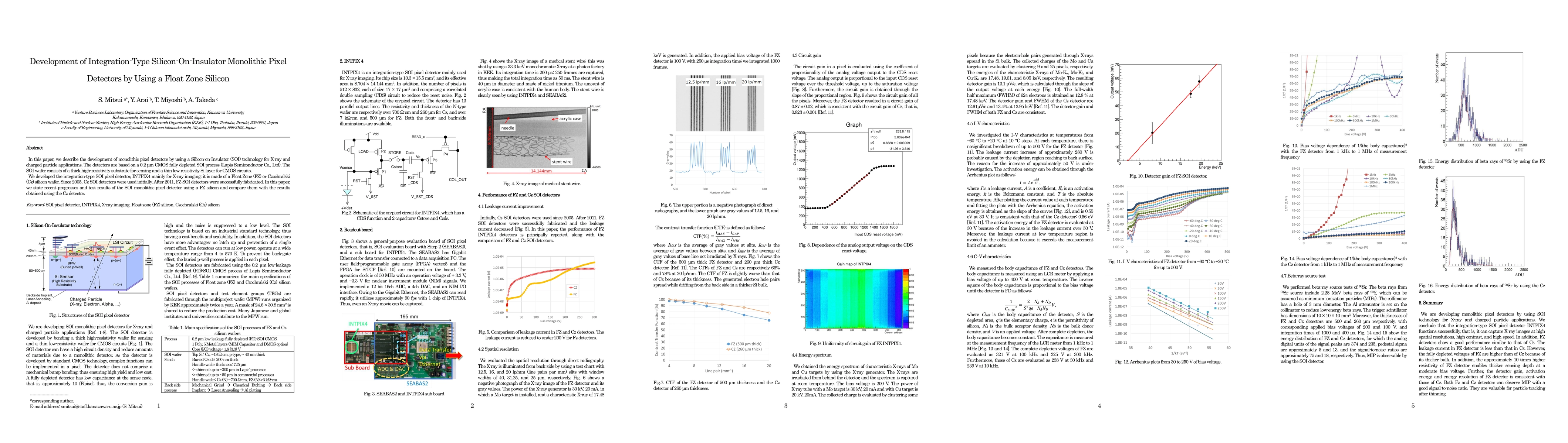 This paper details the development of Silicon-On-Insulator (SOI) monolithic pixel detectors for X-ray and charged particle applications, focusing on the integration-type INTPIX4 detector made using Float Zone (FZ) silicon, and compares its performance with earlier Czochralski (Cz) silicon detectors.