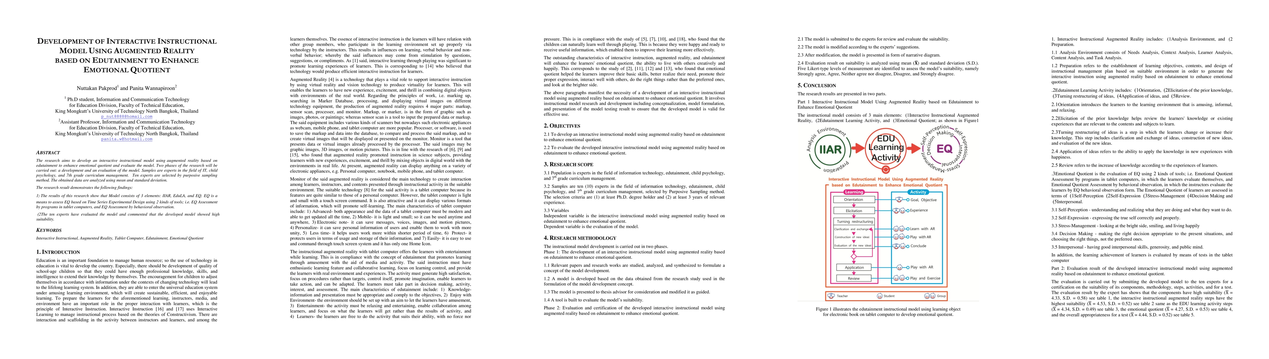 This research develops an interactive instructional model using augmented reality (IIAR) based on edutainment to enhance emotional quotient (EQ). Experts evaluated the model, finding it highly suitable, and the model includes EQ assessment tools for tablet-based and behavioral observation methods.