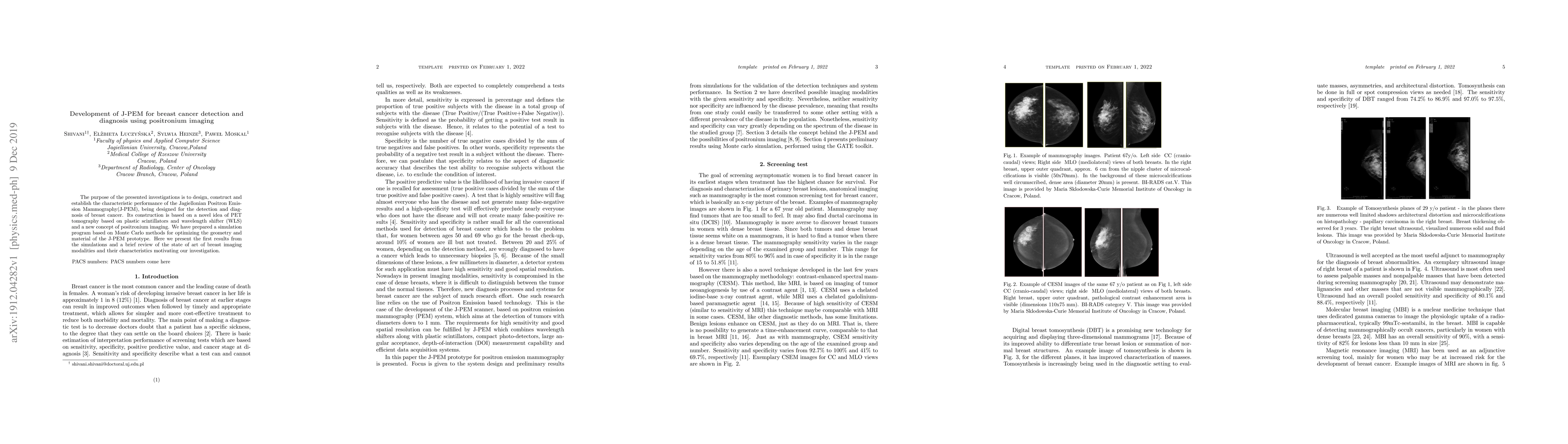 Researchers developed a new breast cancer detection method called J-PEM using positronium imaging, aiming to improve early diagnosis and treatment. The study used simulations and Monte Carlo methods to optimize the J-PEM prototype's geometry and material for better performance.